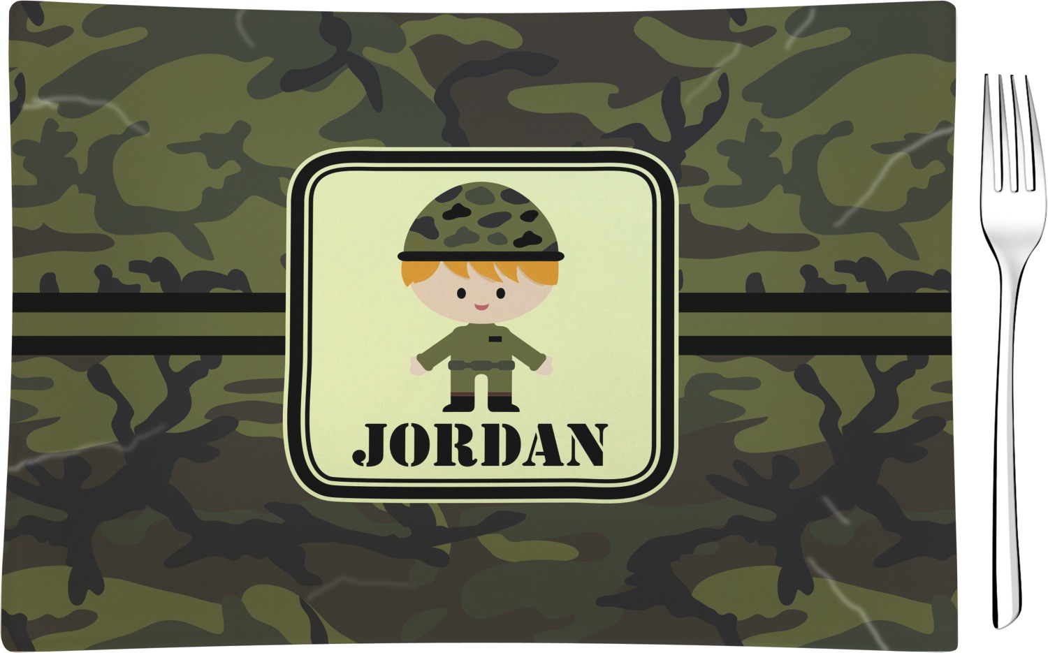 A wide band using coordinating colors runs down the middle of this design. A square label, outlined with camo colors, showcases our little military man with added personalization for the special touch.