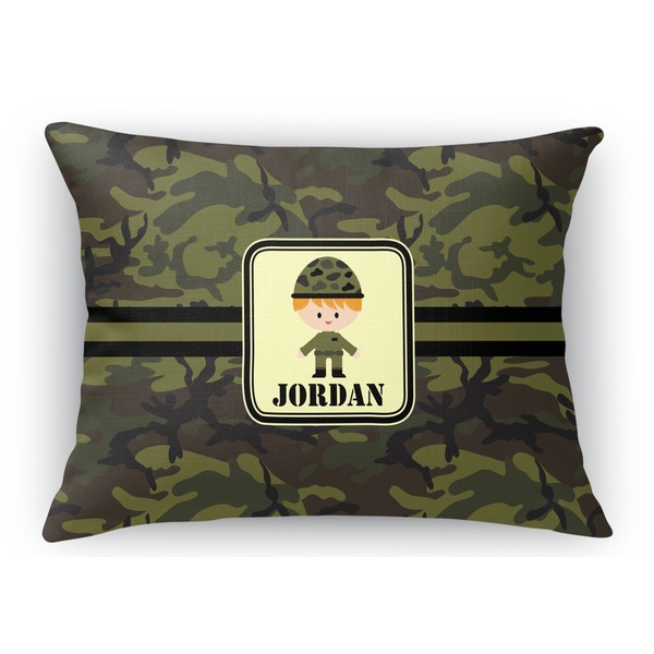 A wide band using coordinating colors runs down the middle of this design. A square label, outlined with camo colors, showcases our little military man with added personalization for the special touch.