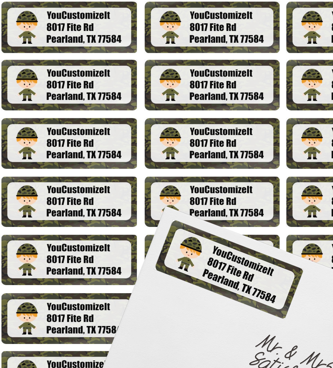 A wide band using coordinating colors runs down the middle of this design. A square label, outlined with camo colors, showcases our little military man with added personalization for the special touch.