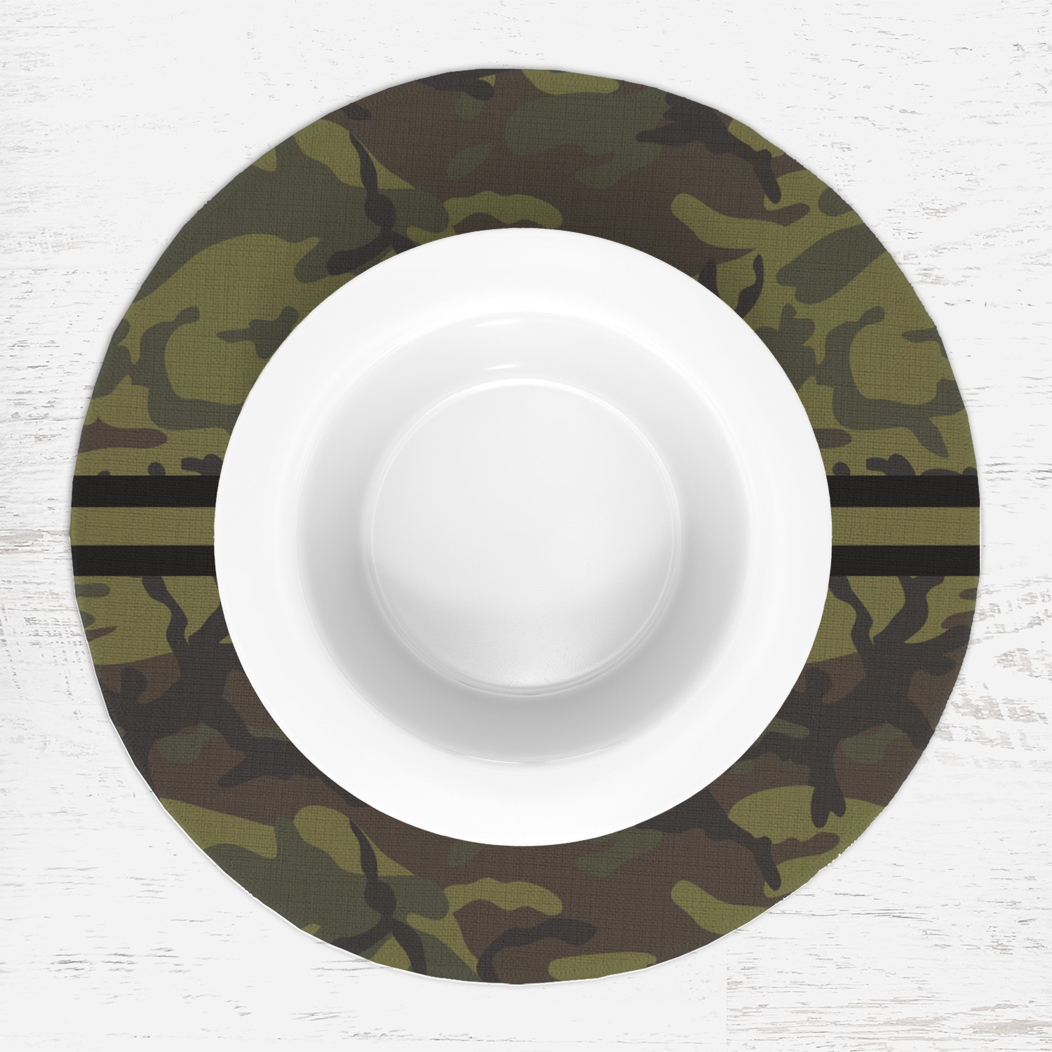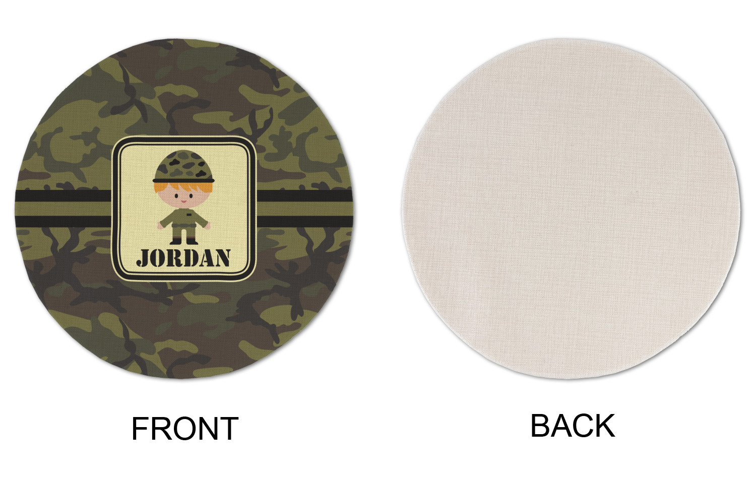 A wide band using coordinating colors runs down the middle of this design. A square label, outlined with camo colors, showcases our little military man with added personalization for the special touch.