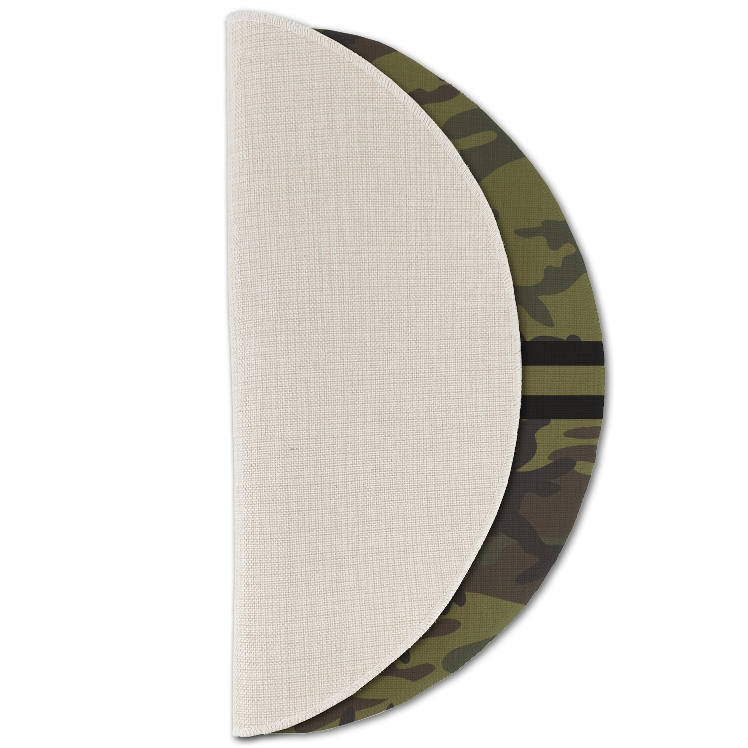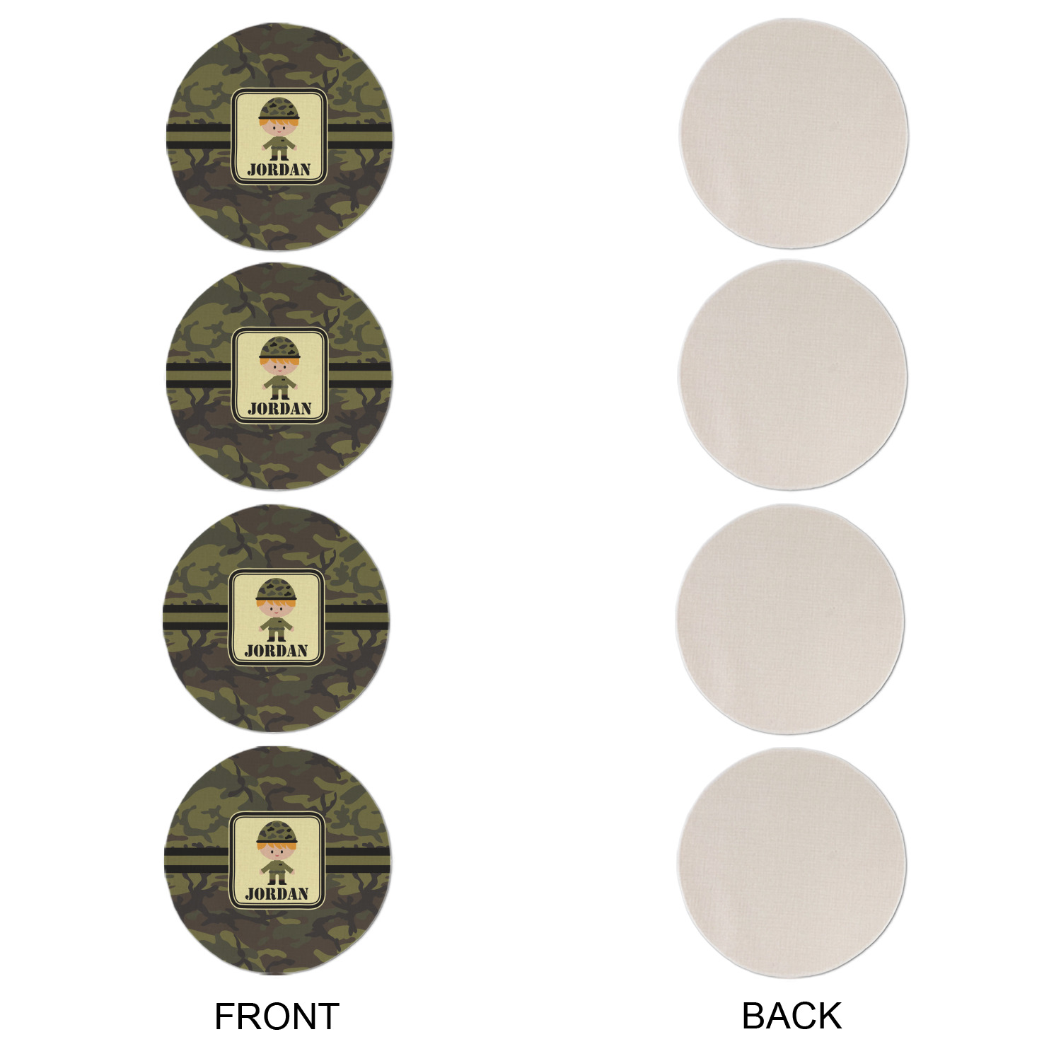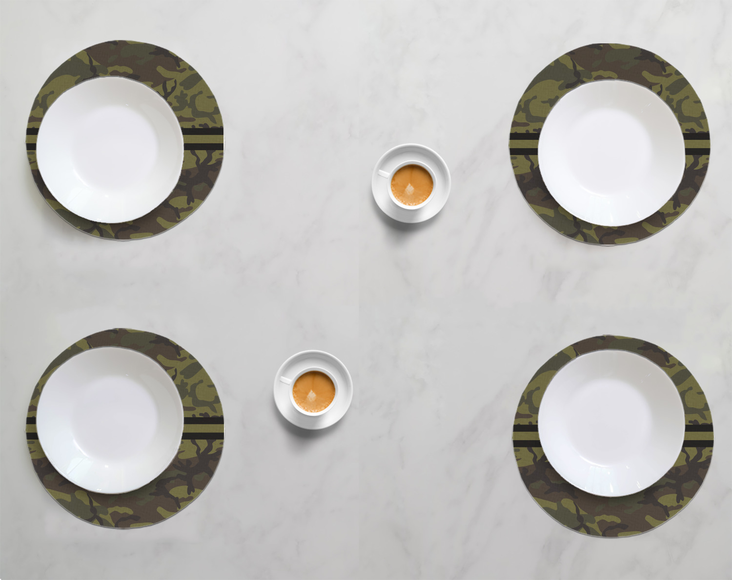 A wide band using coordinating colors runs down the middle of this design. A square label, outlined with camo colors, showcases our little military man with added personalization for the special touch.