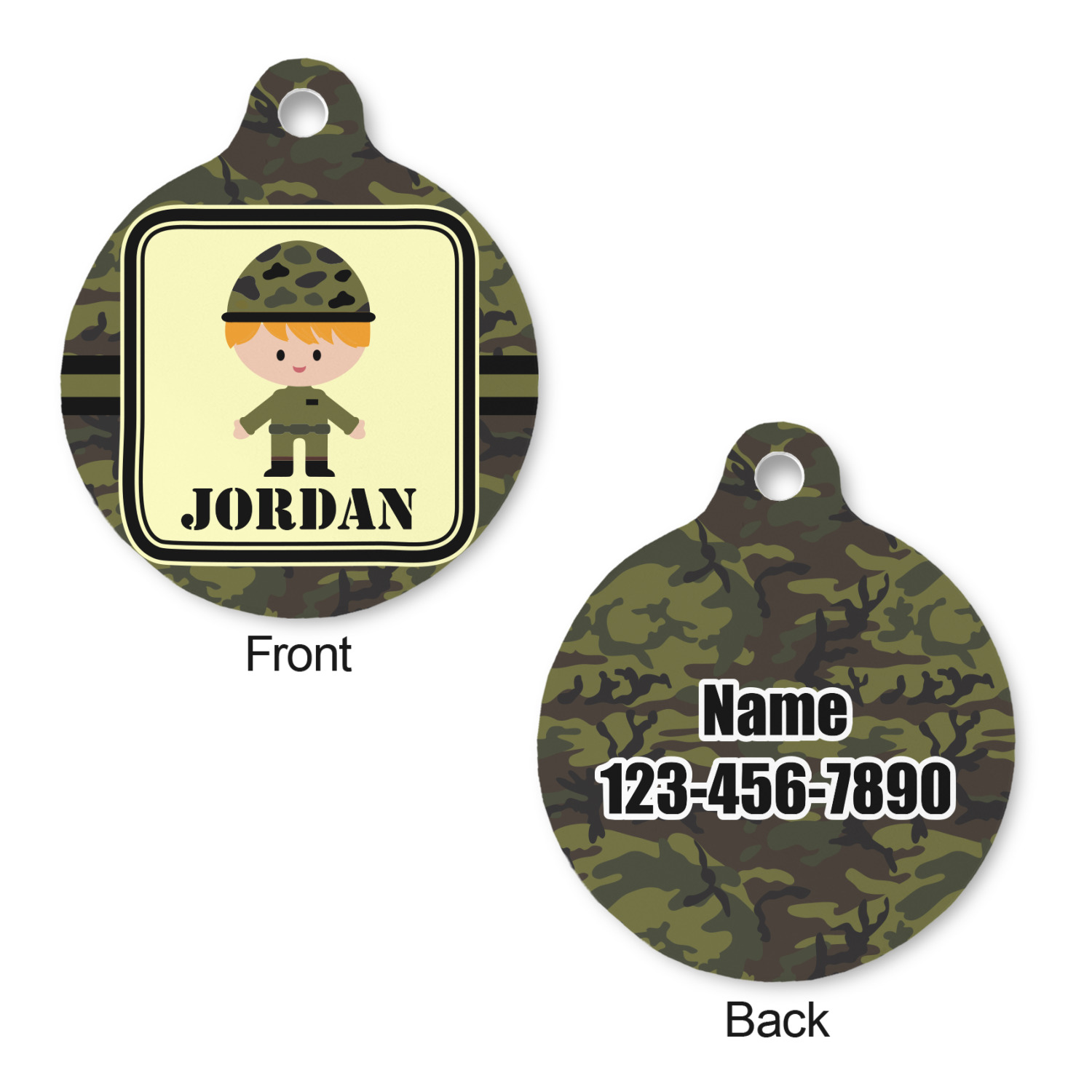 A wide band using coordinating colors runs down the middle of this design. A square label, outlined with camo colors, showcases our little military man with added personalization for the special touch.