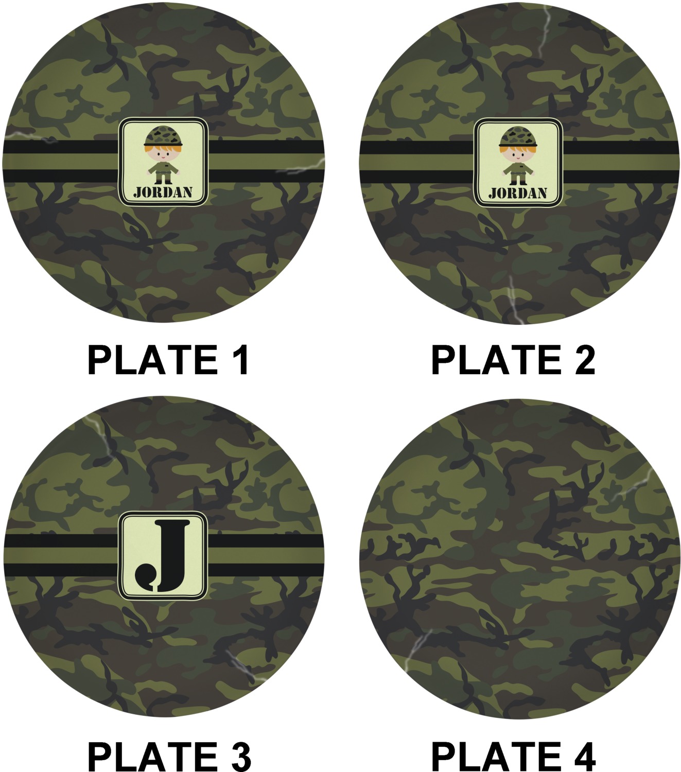 A wide band using coordinating colors runs down the middle of this design. A square label, outlined with camo colors, showcases our little military man with added personalization for the special touch.