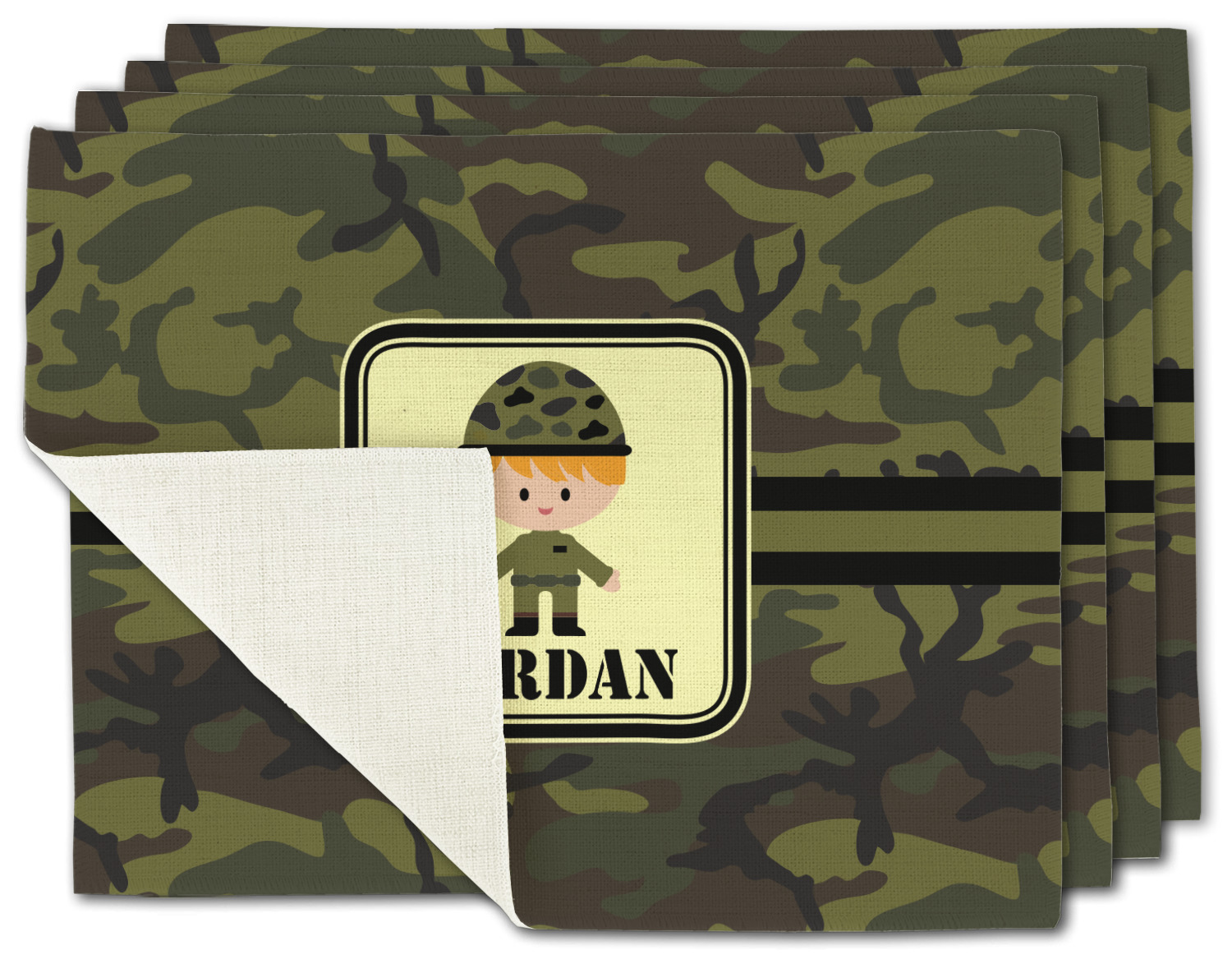 A wide band using coordinating colors runs down the middle of this design. A square label, outlined with camo colors, showcases our little military man with added personalization for the special touch.