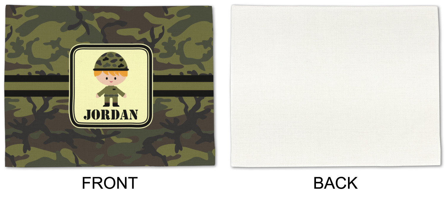 A wide band using coordinating colors runs down the middle of this design. A square label, outlined with camo colors, showcases our little military man with added personalization for the special touch.