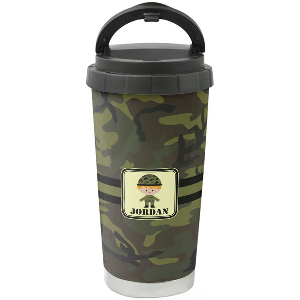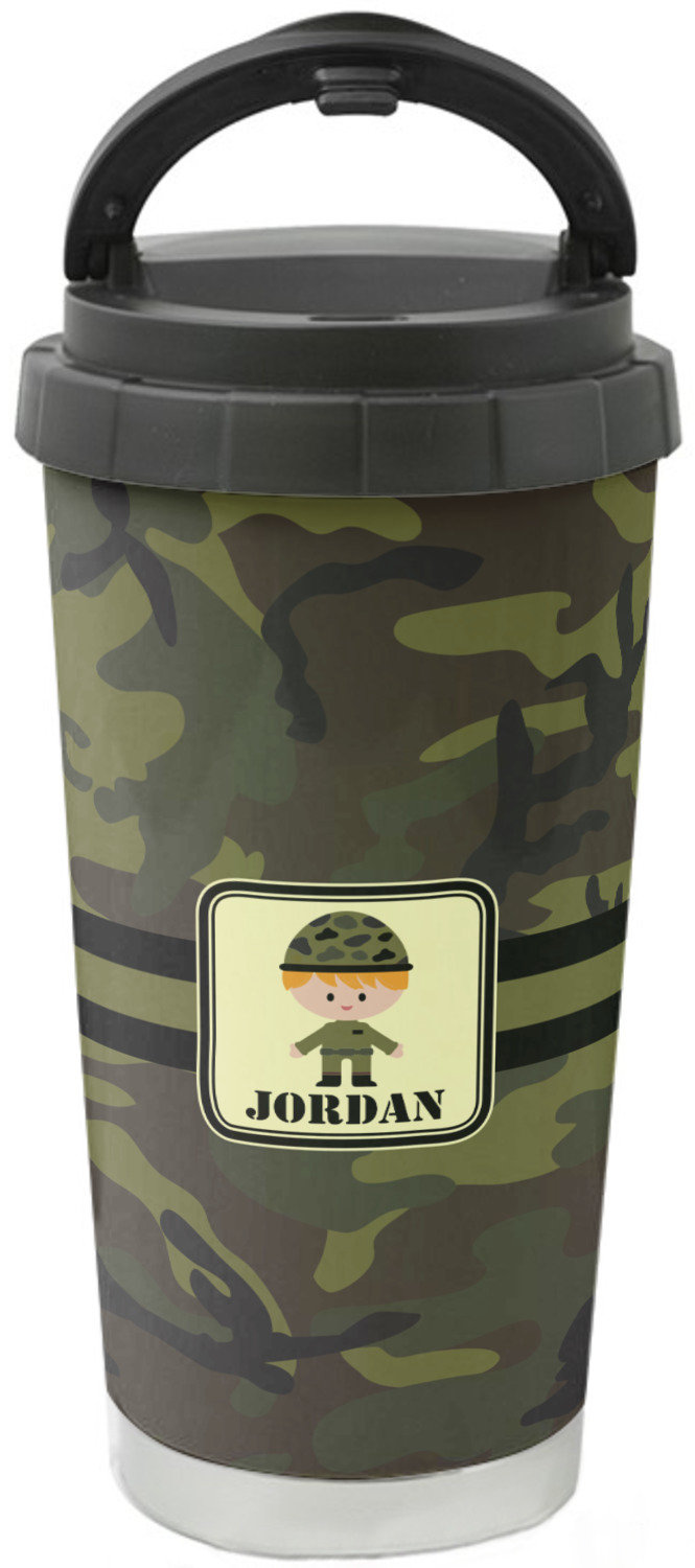 A wide band using coordinating colors runs down the middle of this design. A square label, outlined with camo colors, showcases our little military man with added personalization for the special touch.