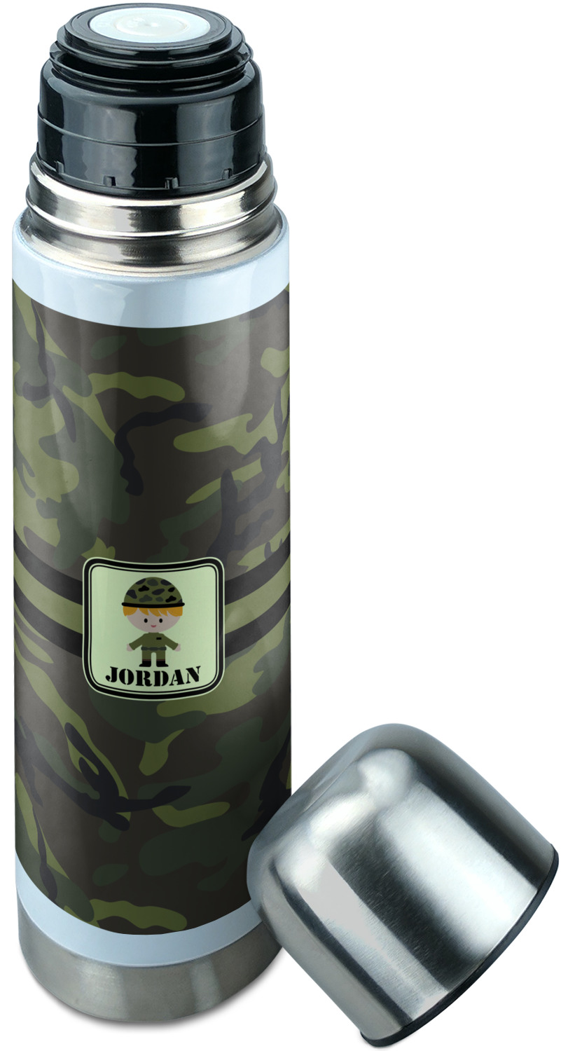 Manufactured from stainless steel, this thermos is built durably and double-walled insulated to preserve the temperature of your drink for hours. It also features a screw off lid that is made to also function as a small cup. Upon unscrewing this part of the thermos bottle, a pop-open, pour feature emerges. This feature allows you to slowly pour your beverage into your lid, ensuring a steady, controlled pour into your lid or other cup. With a capacity of 25 ounces, these large thermoses can hold several servings of your favorite beverage. Your customization is displayed all around the bottle with bright, vibrant color.