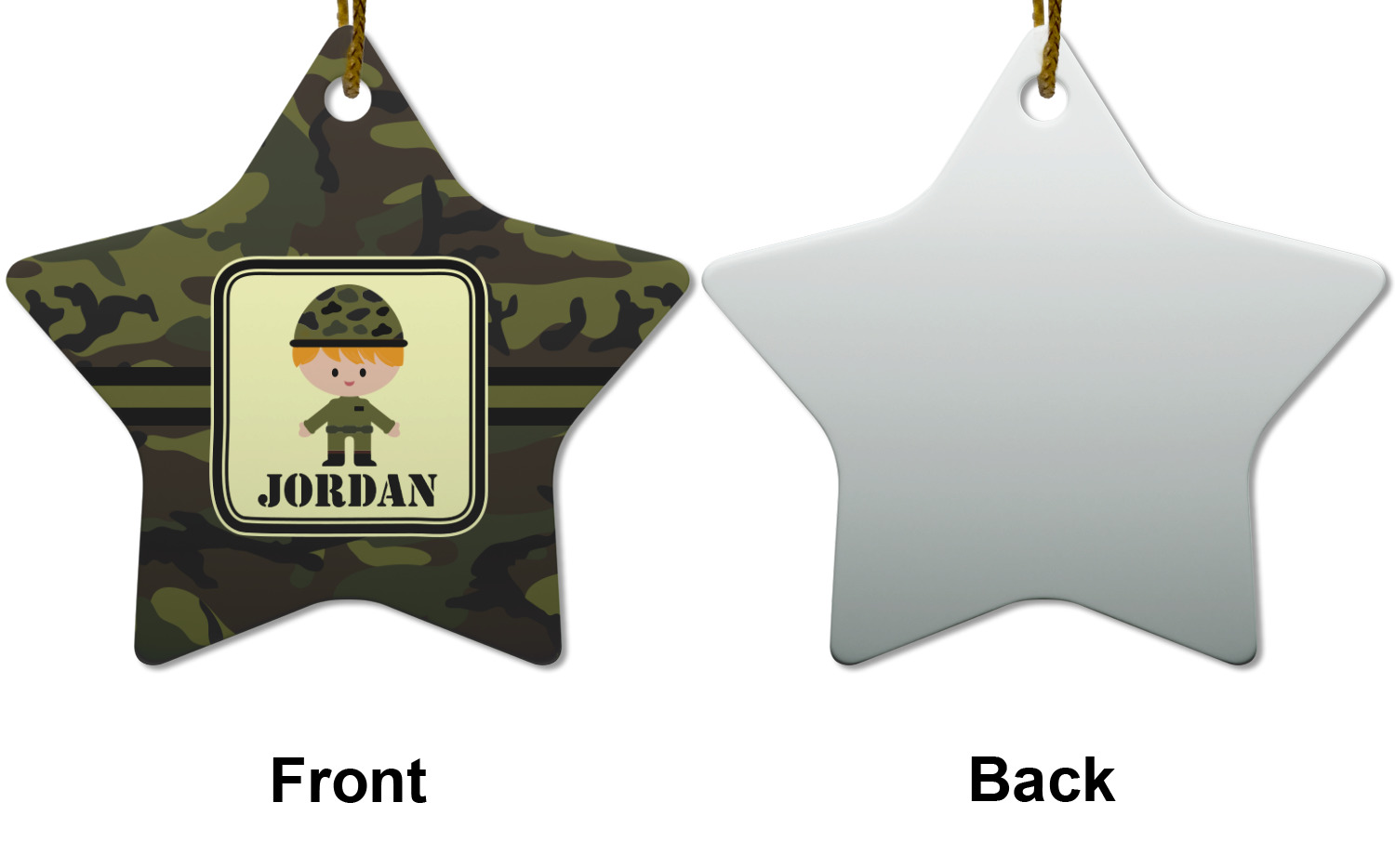 A wide band using coordinating colors runs down the middle of this design. A square label, outlined with camo colors, showcases our little military man with added personalization for the special touch.