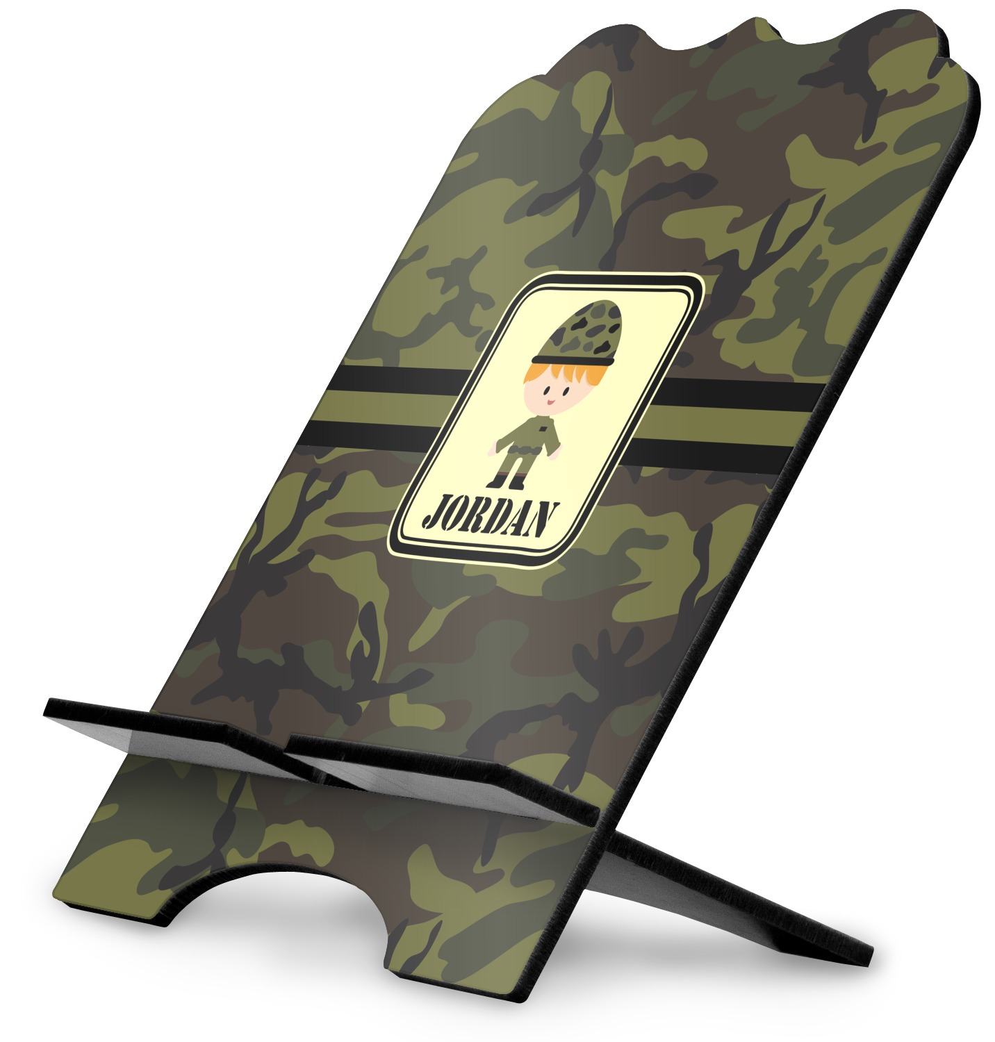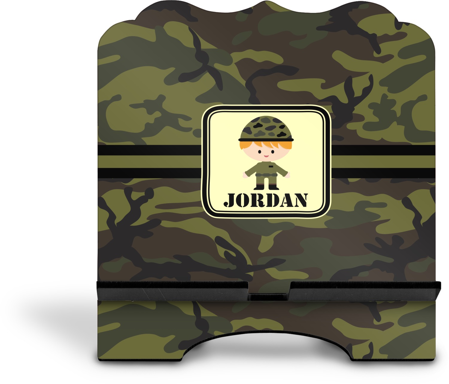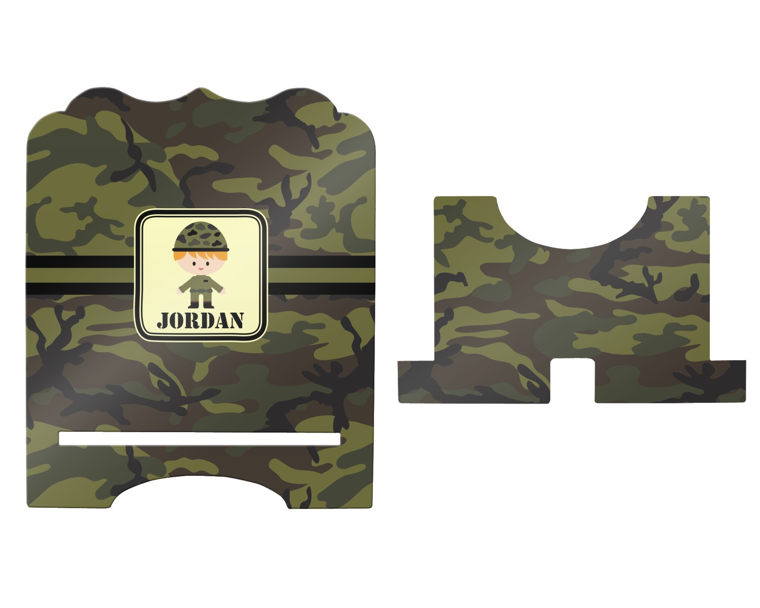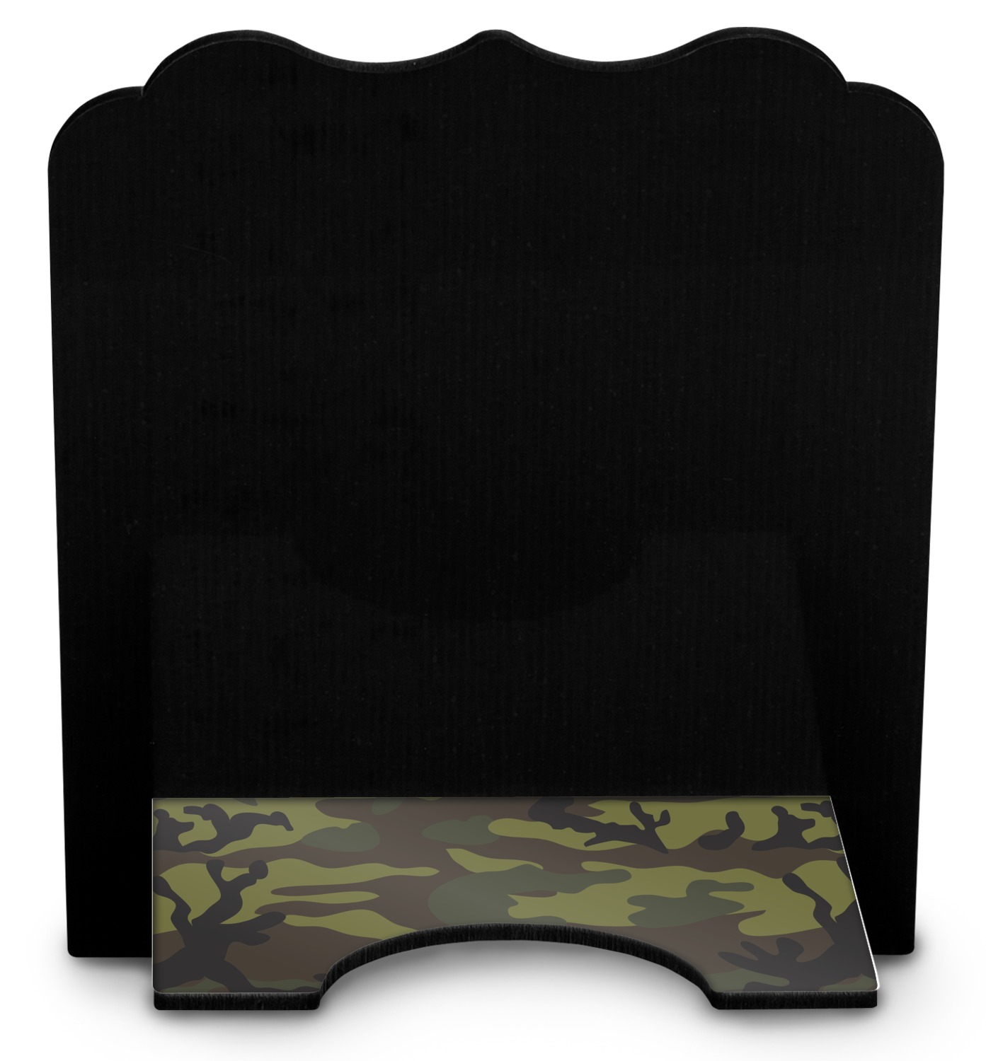 A wide band using coordinating colors runs down the middle of this design. A square label, outlined with camo colors, showcases our little military man with added personalization for the special touch.