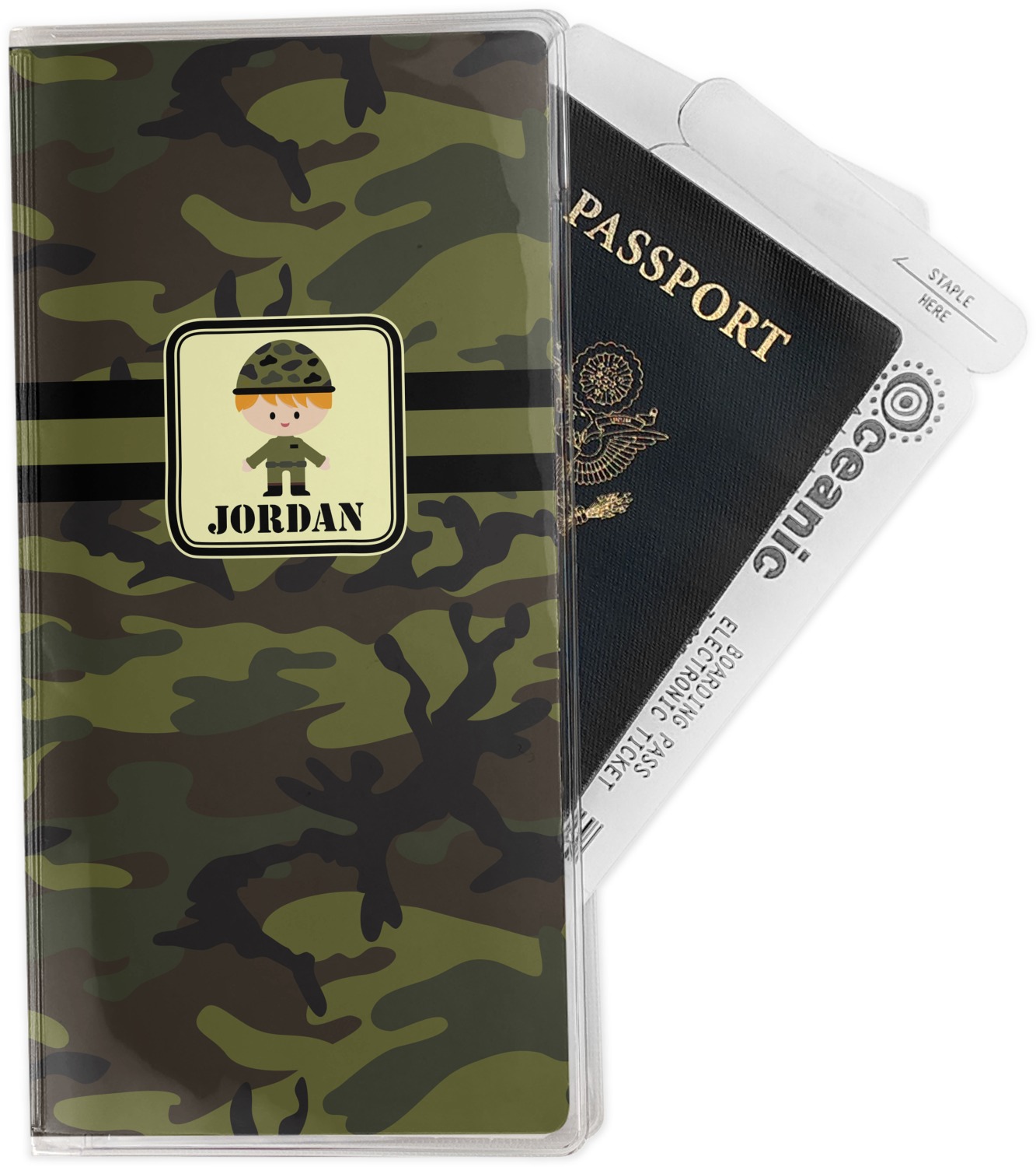 A wide band using coordinating colors runs down the middle of this design. A square label, outlined with camo colors, showcases our little military man with added personalization for the special touch.