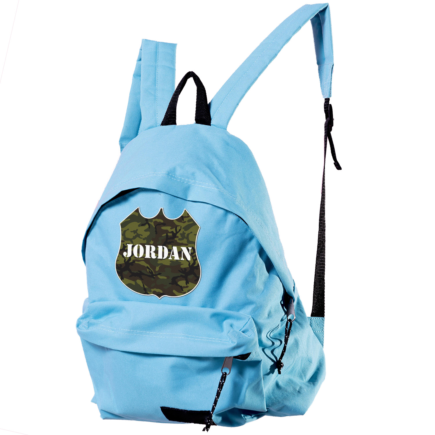 A wide band using coordinating colors runs down the middle of this design. A square label, outlined with camo colors, showcases our little military man with added personalization for the special touch.