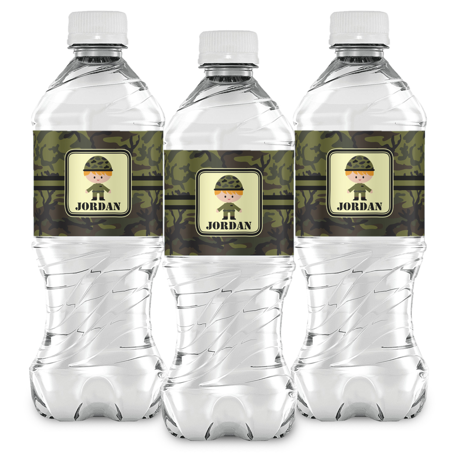 A wide band using coordinating colors runs down the middle of this design. A square label, outlined with camo colors, showcases our little military man with added personalization for the special touch.