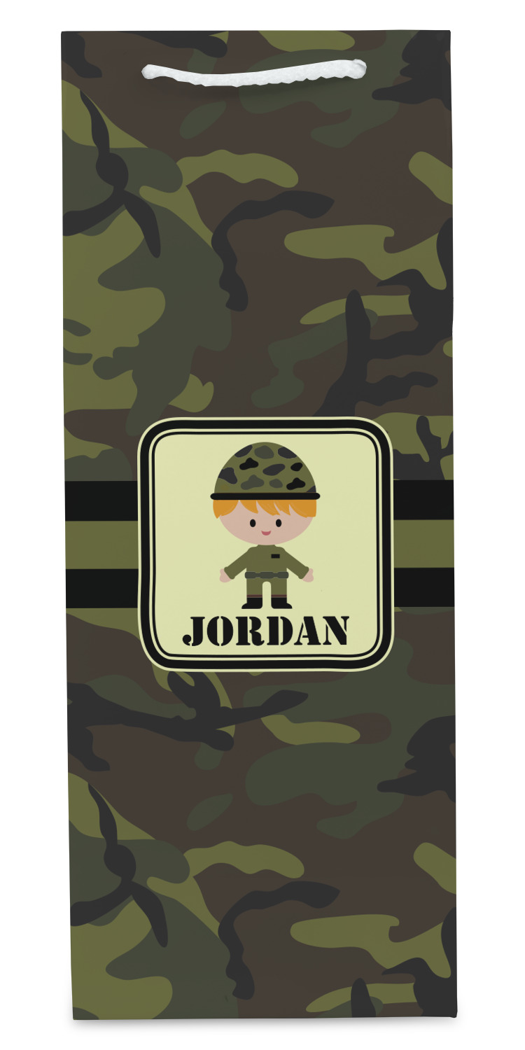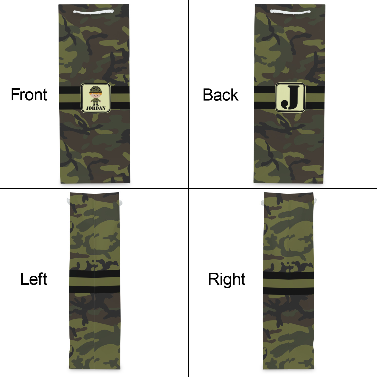 A wide band using coordinating colors runs down the middle of this design. A square label, outlined with camo colors, showcases our little military man with added personalization for the special touch.