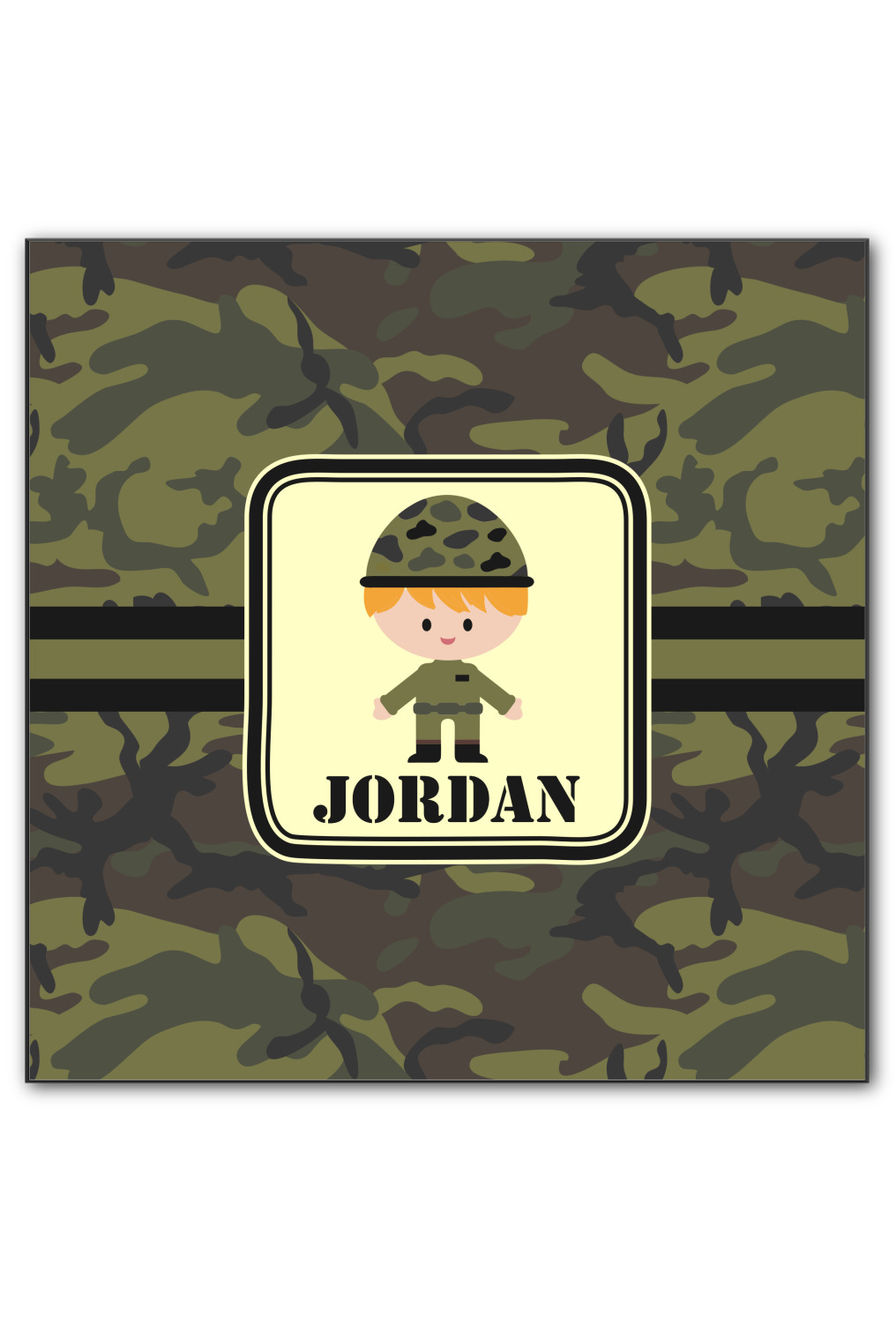 A wide band using coordinating colors runs down the middle of this design. A square label, outlined with camo colors, showcases our little military man with added personalization for the special touch.