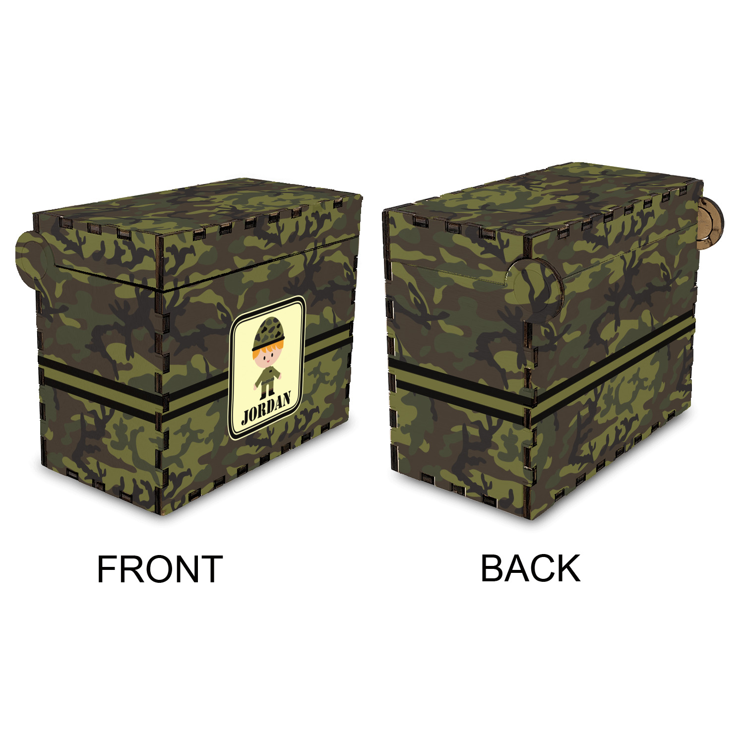 A wide band using coordinating colors runs down the middle of this design. A square label, outlined with camo colors, showcases our little military man with added personalization for the special touch.
