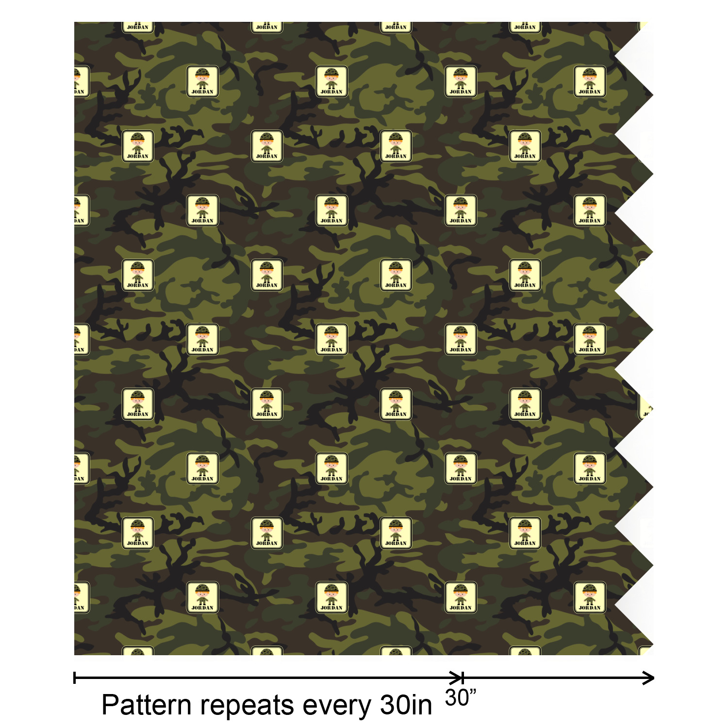 A wide band using coordinating colors runs down the middle of this design. A square label, outlined with camo colors, showcases our little military man with added personalization for the special touch.