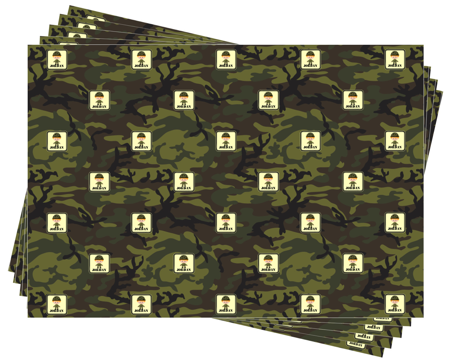 A wide band using coordinating colors runs down the middle of this design. A square label, outlined with camo colors, showcases our little military man with added personalization for the special touch.