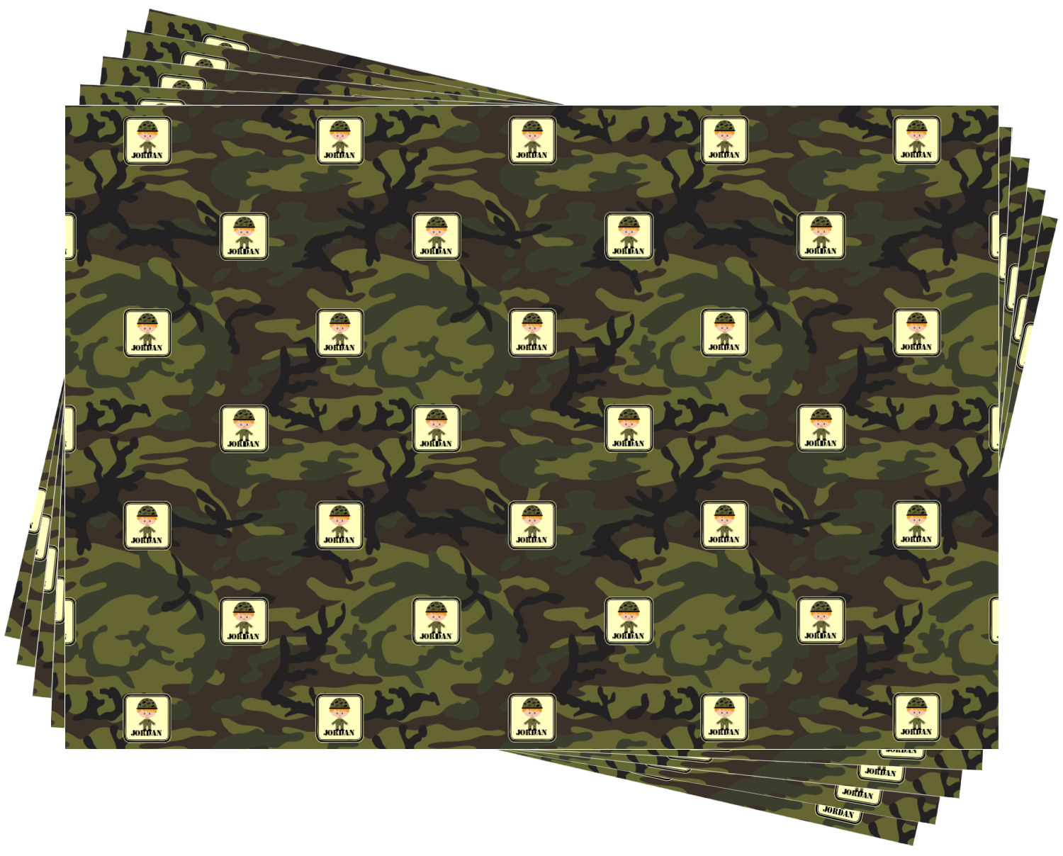 A wide band using coordinating colors runs down the middle of this design. A square label, outlined with camo colors, showcases our little military man with added personalization for the special touch.