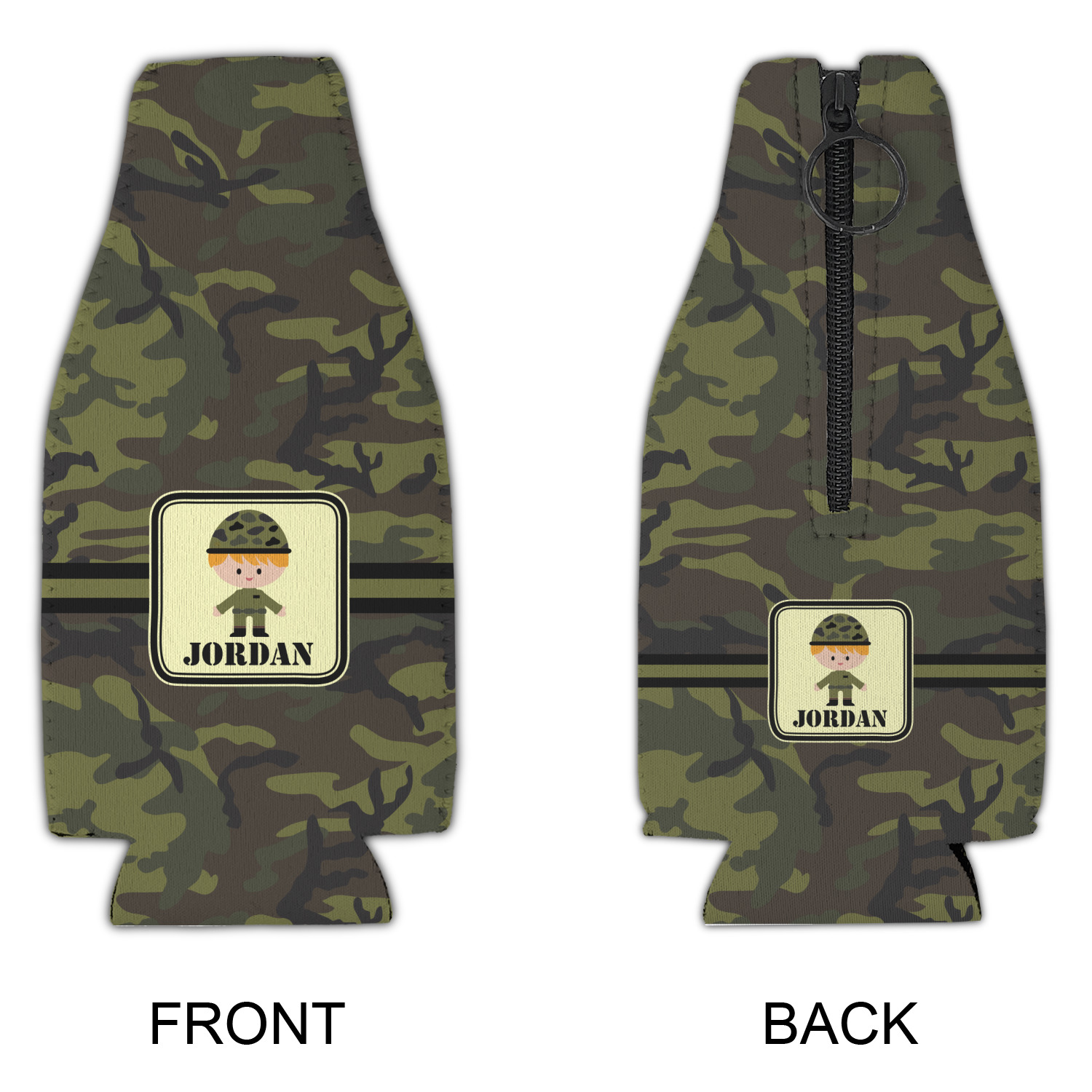 A wide band using coordinating colors runs down the middle of this design. A square label, outlined with camo colors, showcases our little military man with added personalization for the special touch.