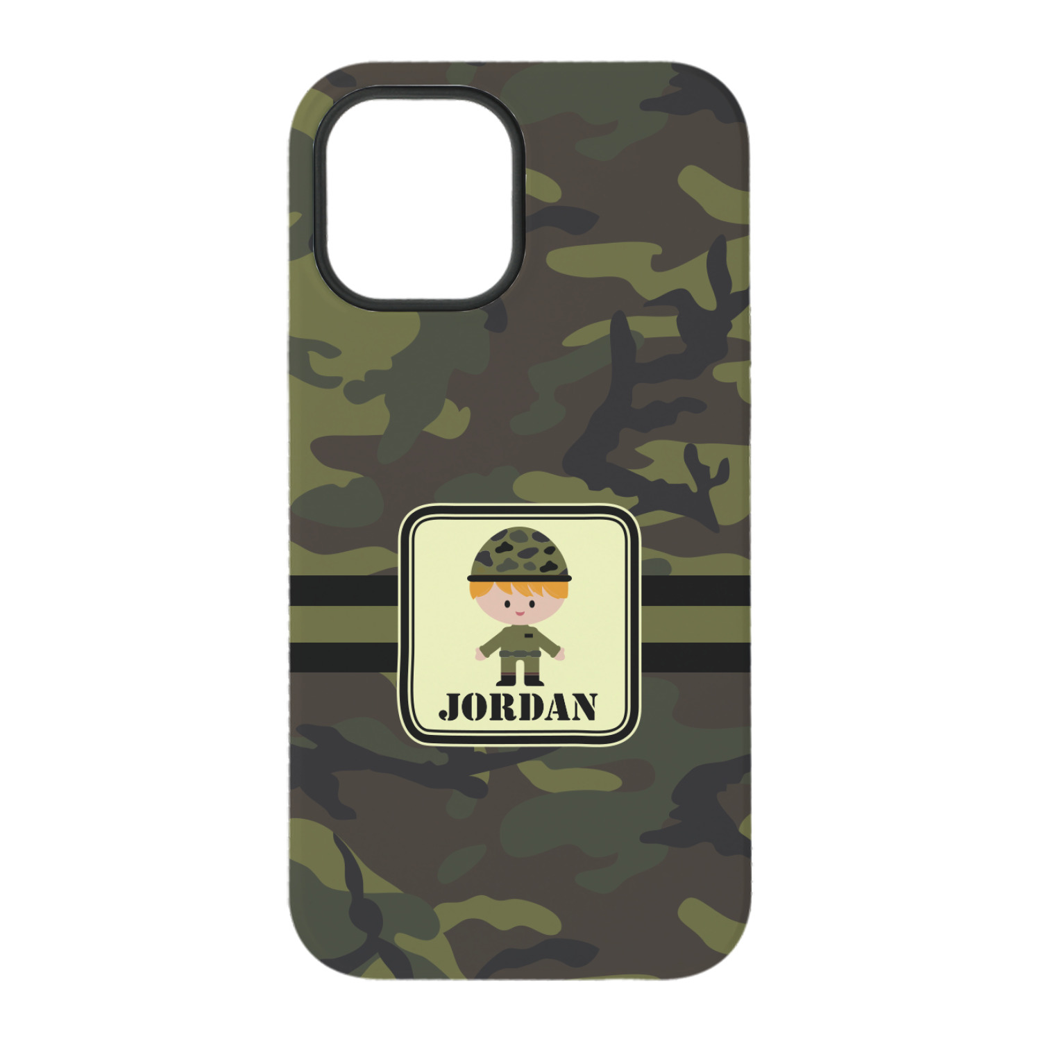 A wide band using coordinating colors runs down the middle of this design. A square label, outlined with camo colors, showcases our little military man with added personalization for the special touch.