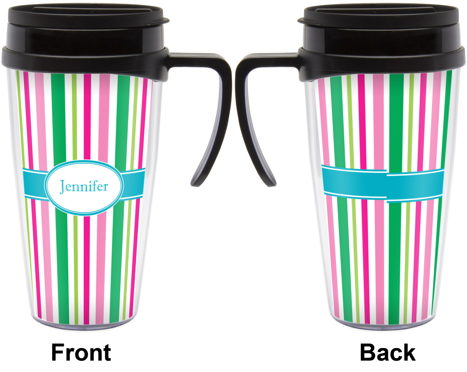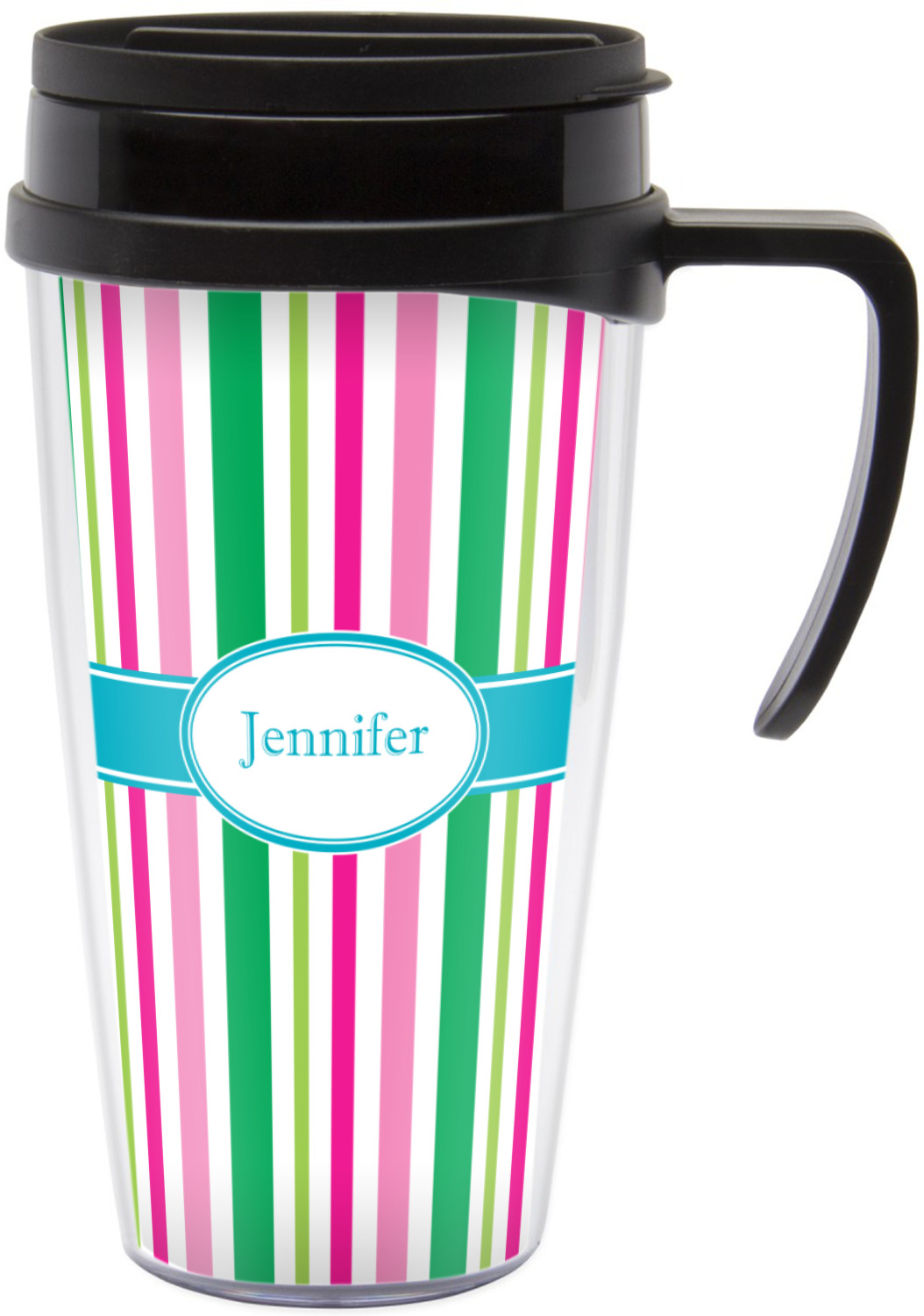 These thermal mugs are free of BPA, and insulated, to keep your drinks hot or cold. The black, snap on lid and the slider for sipping allows you to conveniently sip your drink without constantly worrying about a disastrous spill. We offer this mug with and without a handle, to better suit your needs. Each custom thermal mug holds up to 16 ounces of liquid and displays your customization on all sides on premium gloss media inserts.