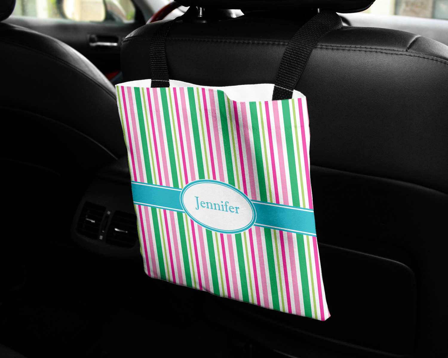 These car back seat organizers are sturdy tote-like bags, fabricated from a robust polyester, and features a single handle on the back side. The strap features an attachable velcro for easy attachment to headrests, grocery carts, car seats, and more. Simply undo the velcro, loop the strap around the headrest, reattach the velcro, and let the organizer hang from the front seat. These car organizers are the perfect means of increasing your backseat's legroom, while storing multiple items in one place for better accessibility. Each car back seat organizer measures at 10 by 10 inches, and features your personalized design printed across its front and back.