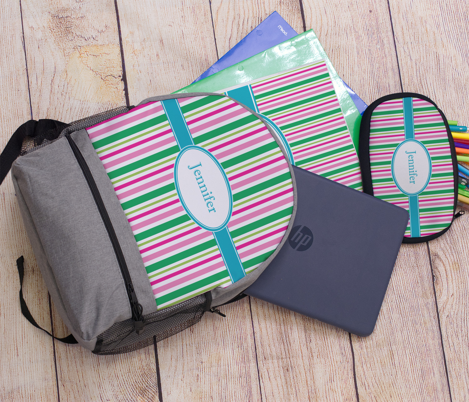 We have taken traditional grosgrain stripes and spiced it up a bit with hot pink, apple green, and a ribbon in a delightfully contrasting teal.