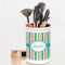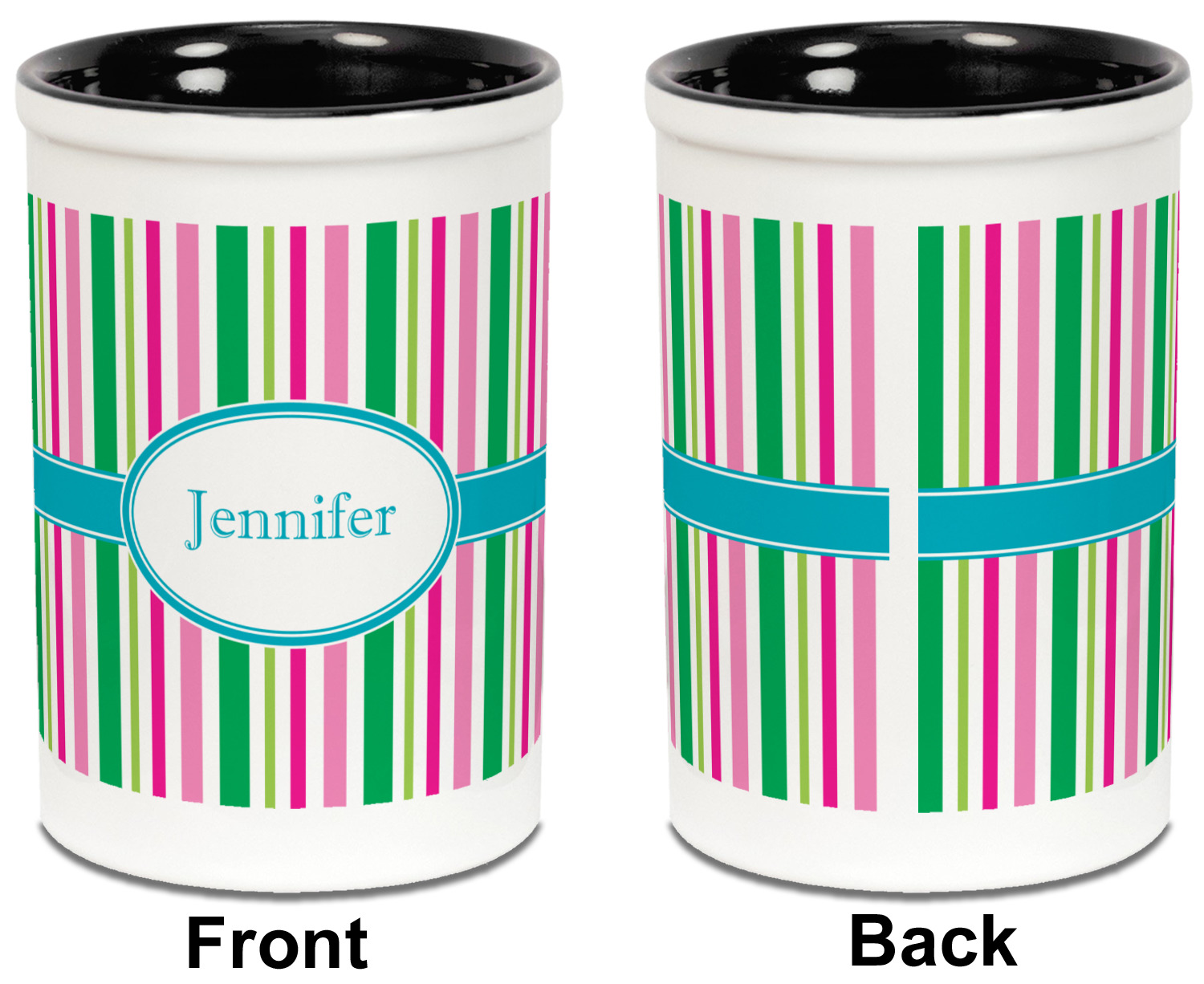 Both the blue and black pencil holders are a ceramic material, giving you a sturdy and long-lasting pen and pencil holder. We print your designs on the exterior of the pencil cup, covering most of the outside surface. There is a small white border on the top and bottom of the exterior of the pen holder, setting apart your design from the interior's color. Our ceramic pen caddy is roughly 3.5" x 3.5" x 5" in dimensions.