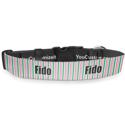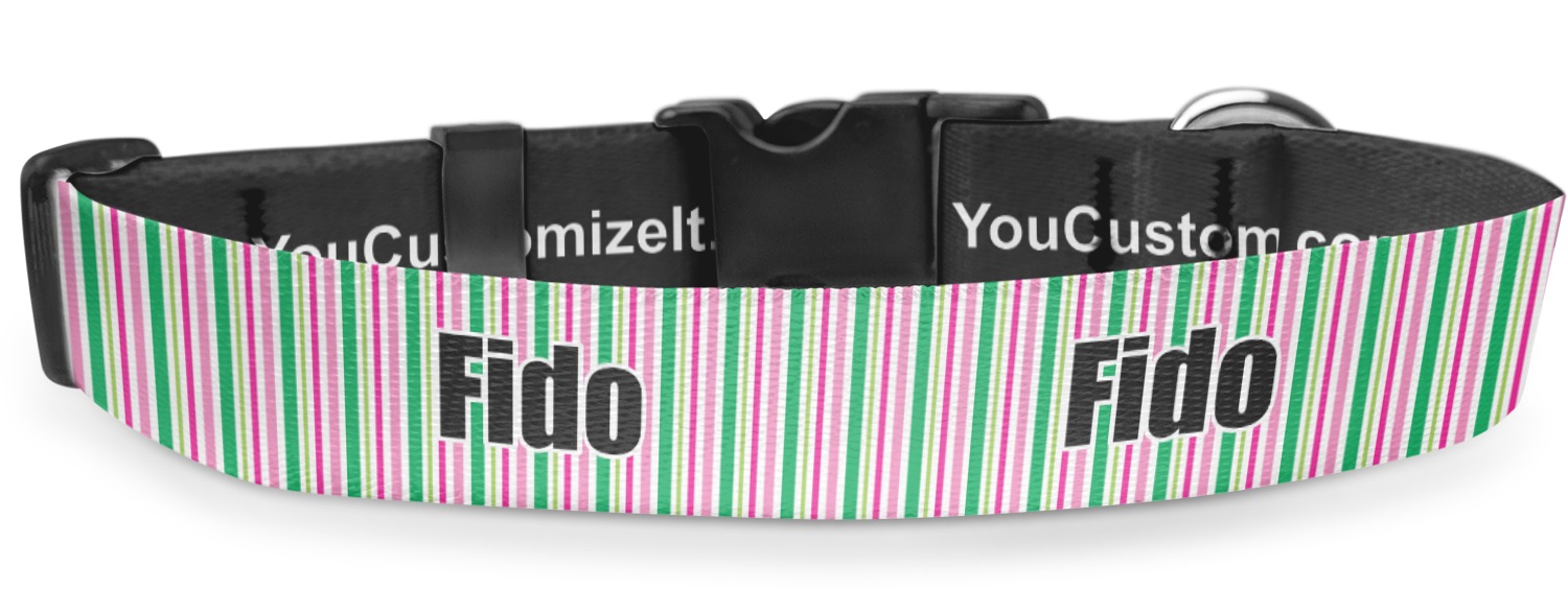 This sturdy collar, made from a durable nylon weave, will outlive your dog's episodes of excited tugging and pulling. Courtesy of its thick plastic buckle and adjuster, this collar is adjustable and accommodating of any dog. Structurally, the collar is a single piece of nylon weave that is sewn together, and features a solid metal loop where you can attach a leash or dog tag. We print and display your dog's name and pattern across the middle of the personalized dog collar.