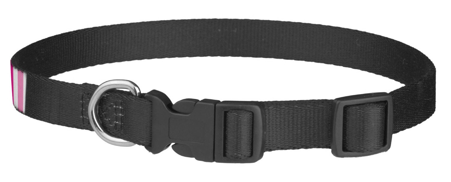 This sturdy collar, made from a durable nylon weave, will outlive your dog's episodes of excited tugging and pulling. Courtesy of its thick plastic buckle and adjuster, this collar is adjustable and accommodating of any dog. Structurally, the collar is a single piece of nylon weave that is sewn together, and features a solid metal loop where you can attach a leash or dog tag. We print and display your dog's name and pattern across the middle of the personalized dog collar.