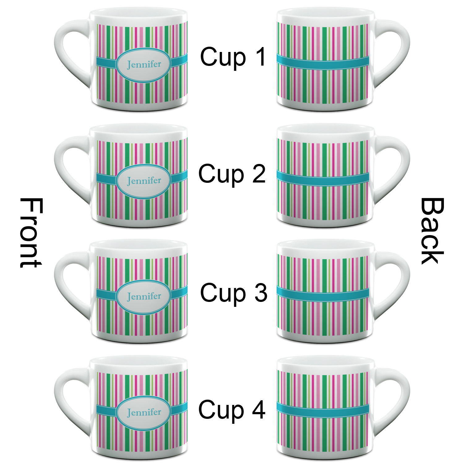 Each of our espresso mugs is a ceramic material sure to keep your drink warm. Personalize one cup for yourself, or order a set of 4! Its the perfect little gift for any coffee lover! We carry two sizes for you to personalize - 3 oz. (approx. 3.25" x 2.325" x 2.625") or 6 oz. (approx. 4" x 2.9" x 2.9"). Our 3 oz. mug is perfect for that single shot espresso while our 6 oz. mug can be your next favorite cappuccino cup holding two shots of espresso!