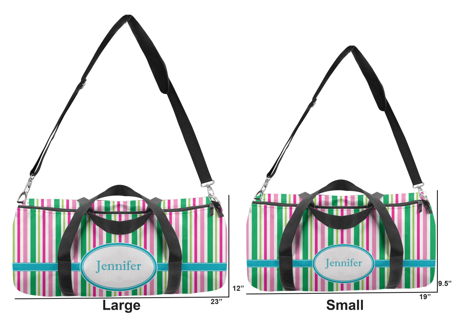 This duffle is a sturdy bag made of a canvas material. It comes in two sizes: Small (19"W x 9.5"H x 9.5"D) and Large (23"W x 12"H x 12"D). The bag is a cylindrical shape with a black adjustable strap and two handles. On one side is an elastic pouch to put a waterbottle or other small item. Your product will be sublimated with your design and is able to be designed on the front, back, and sides. Be sure to remember that the straps may cut into parts of your design if you upload your own artwork.