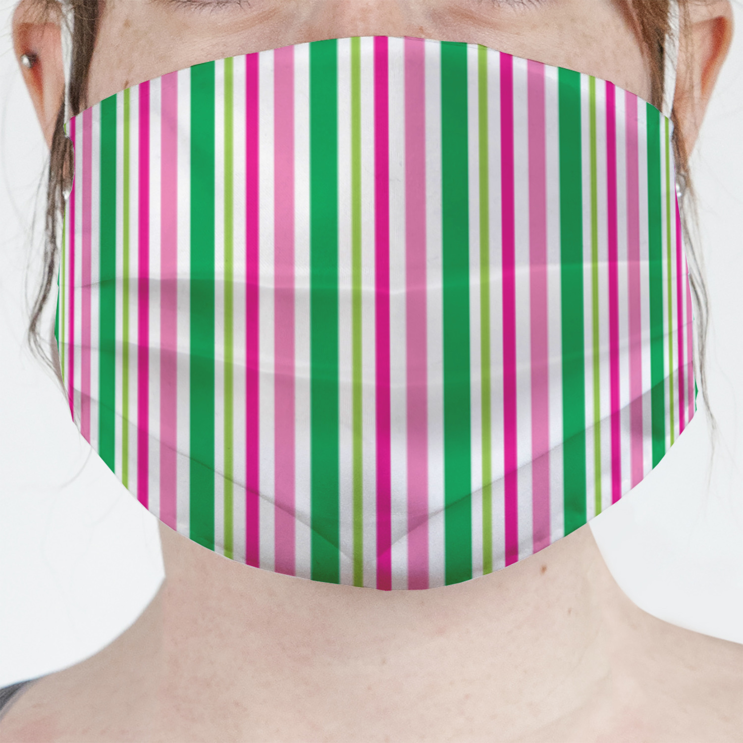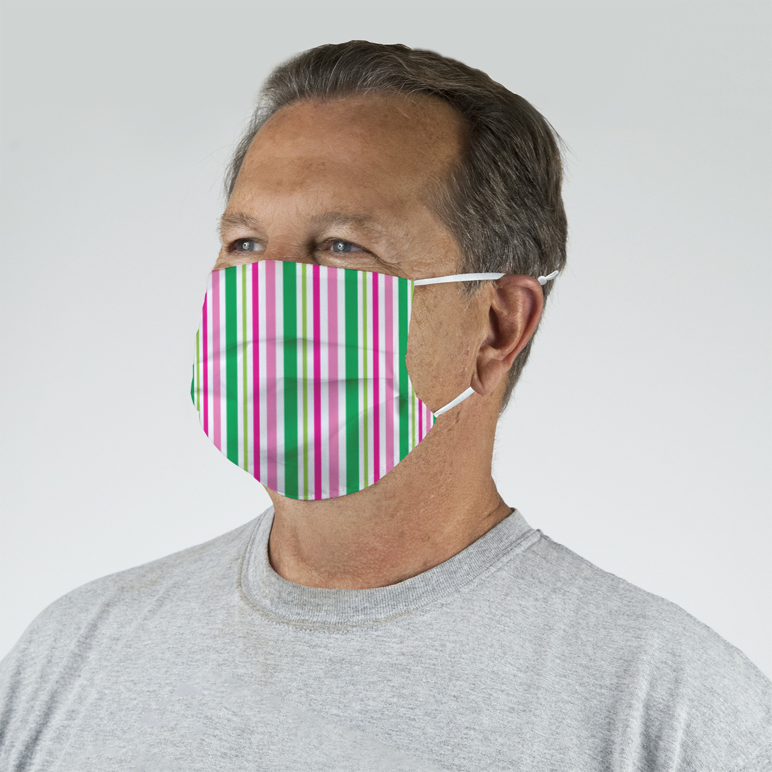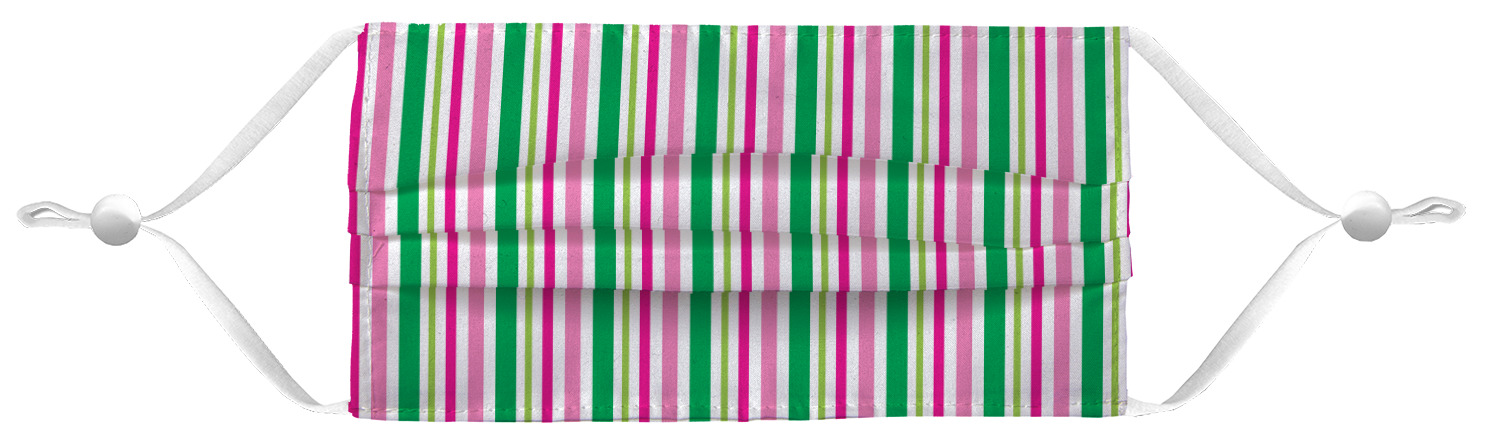 These fun face masks are 7" wide and 3.5" high. They feature pleats, adjustable ear loops, and are made with two layers of fabric. The top layer where your design is printed is a breathable polyester sheeting, while the inside layer is a soft microfiber polyester