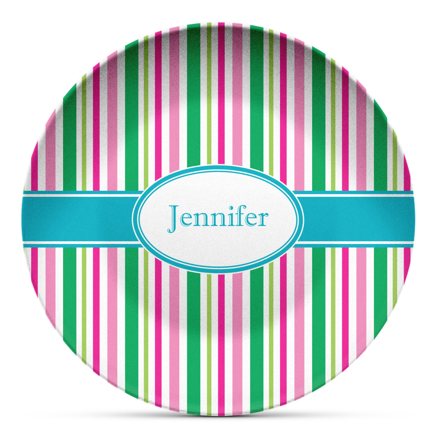These plastic plates have the versatility, durability, and weight of melamine plates but are instead are made from a melamine-free composite, thermo-set, polymer plastic. These plates are made right here, in the USA, without the use of harmful chemicals, such as BPAs, formaldehyde, or DEHPs. Our elegant plastic plates can even withstand temperatures of up to 250 degrees Fahrenheit, for up to 60 minutes. The entire face of the plate exhibits your personalization in bright, vibrant color, and the plate's diameter measures at 10" long.