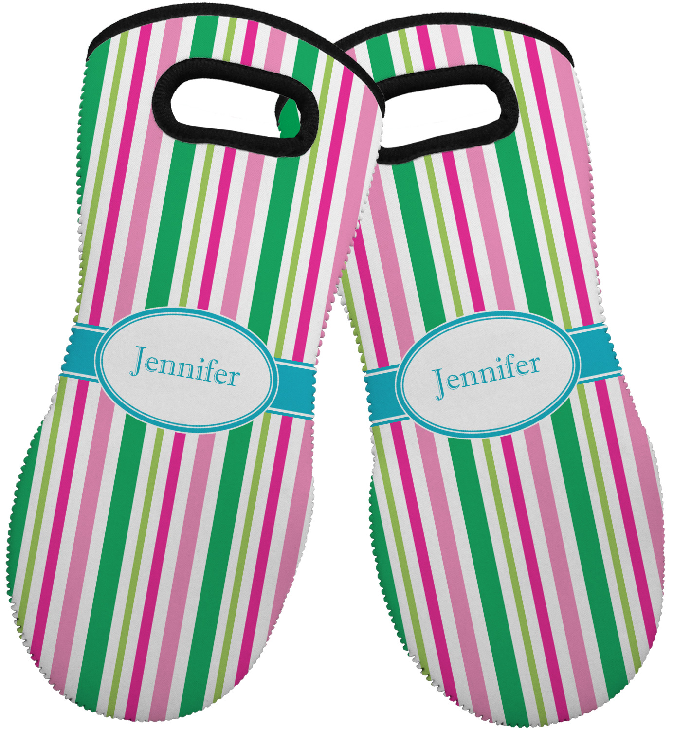 These heat resistant gloves are made entirely of a durable neoprene; the front features a softer texture, while the palm's side has a textured surface, meant to handle heat up to 500 degrees Fahrenheit. Thick, heavy duty stitching connects the two sides. A small, oval cutout appears on the front, and can be used to hang and store the mitt. Your personalization appears on the front, and the upper part of the back of the mitt. The style of these oven mitts are suitable for both the right and left hand, depending on your needs. If you need one for each hand, be sure to order two!