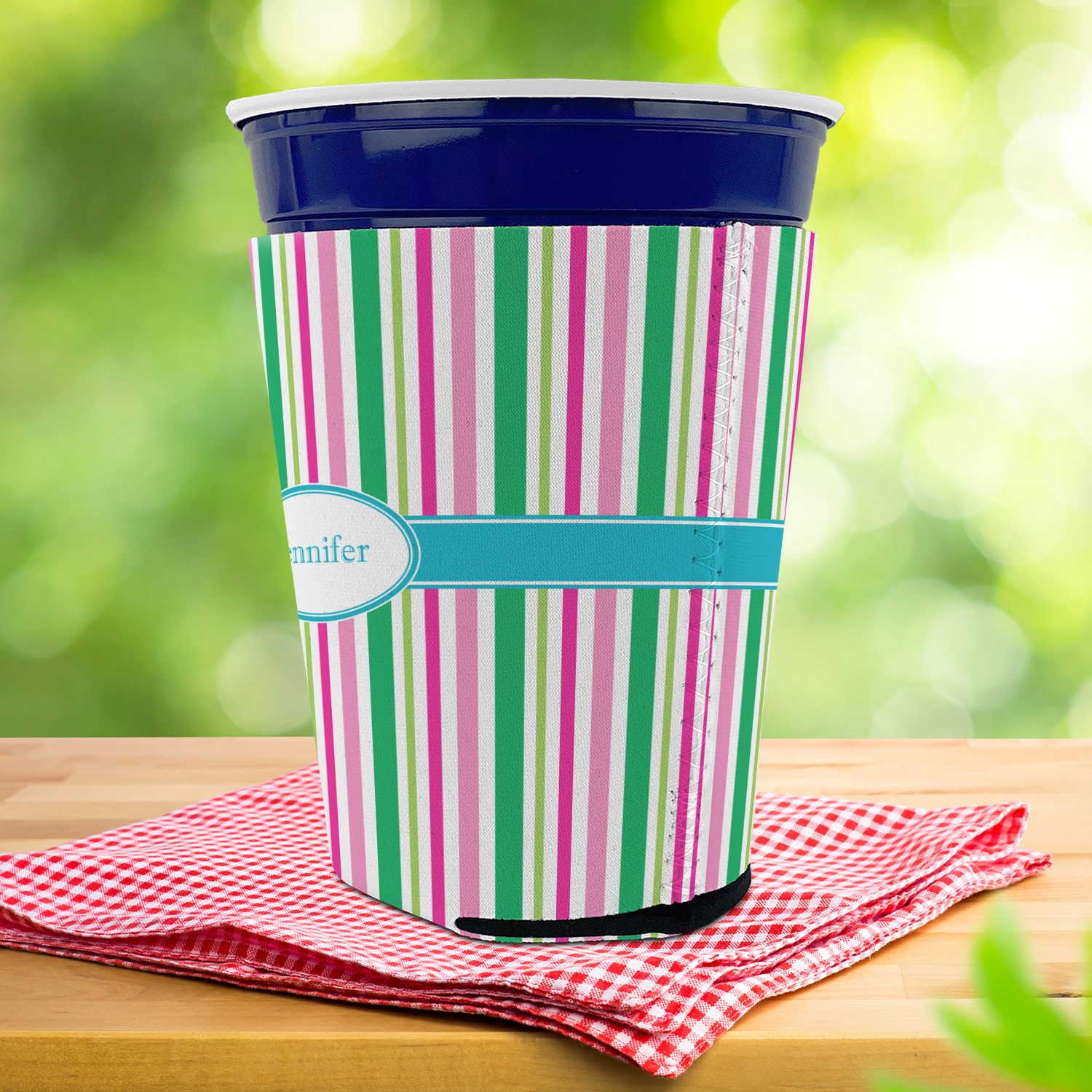 Made from neoprene with a polyester outer fabric and sewn seams, these premium quality party cup sleeves are very durable and will hold up to heavy use. They are available in 2 styles - with a bottom or just a sleeve to go around the outside of the tapered cup. The sleeve covers are about 4" tall and cover about 90% of the classic 16 oz. Solo cup.