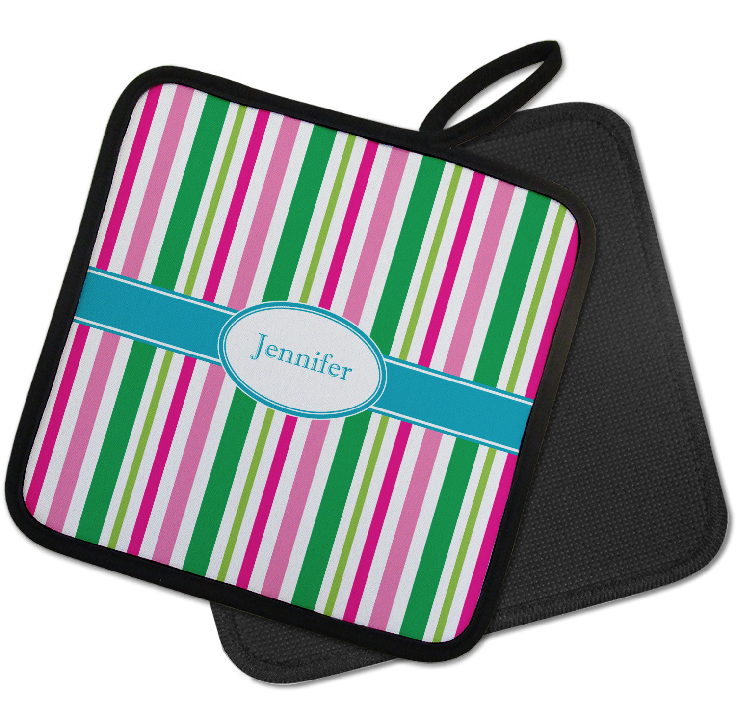 Our personalized pot holders feature a neoprene front that displays your personalization in vibrant colors. The backing of the hot pot holder is rubberized; the textured backing allows you to have a great grip when using this custom pot holder. The two materials are joined with a sleek, black trim, and the holder also includes an attached loop for hanging and storage. The pot holder is approximately 8.75 inches by 8.75 inches and 0.25 inches tall, while the fabric loop is 2.5 inches long. You can purchase a kitchen pot holder by itself or as a set of 2. We also offer a set including one pot holder and one oven mitt.