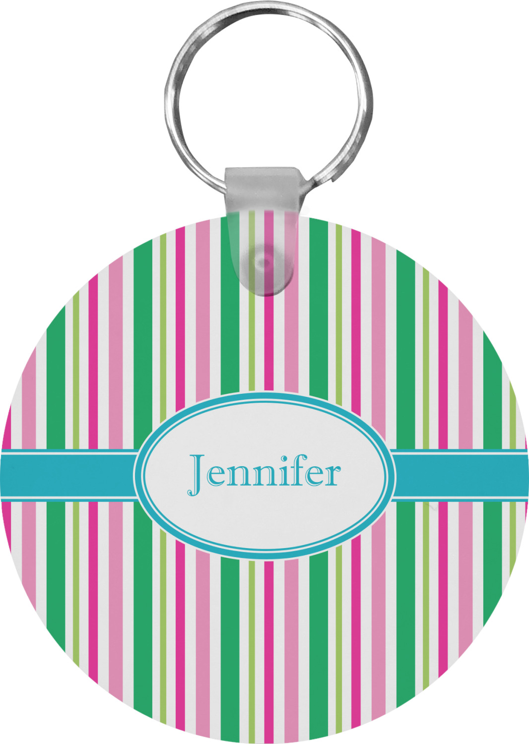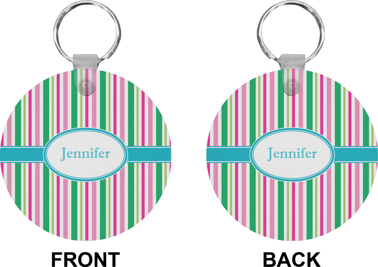 Our personalized keychains attach to the included metal, split key ring with a plastic, removable snap. Since a metal ring is included with your purchase, you have the liberty to keep your keys together on the ring, with or without your unique keychain. We offer this keychain in three different shapes: circle, heart, or diamond. We print your personalized design(s) on both sides of the key chain, and the surface has a glossy, reflective finish that only emphasizes your design. Each keychain is approximately 2.25 by 2.25 inches.