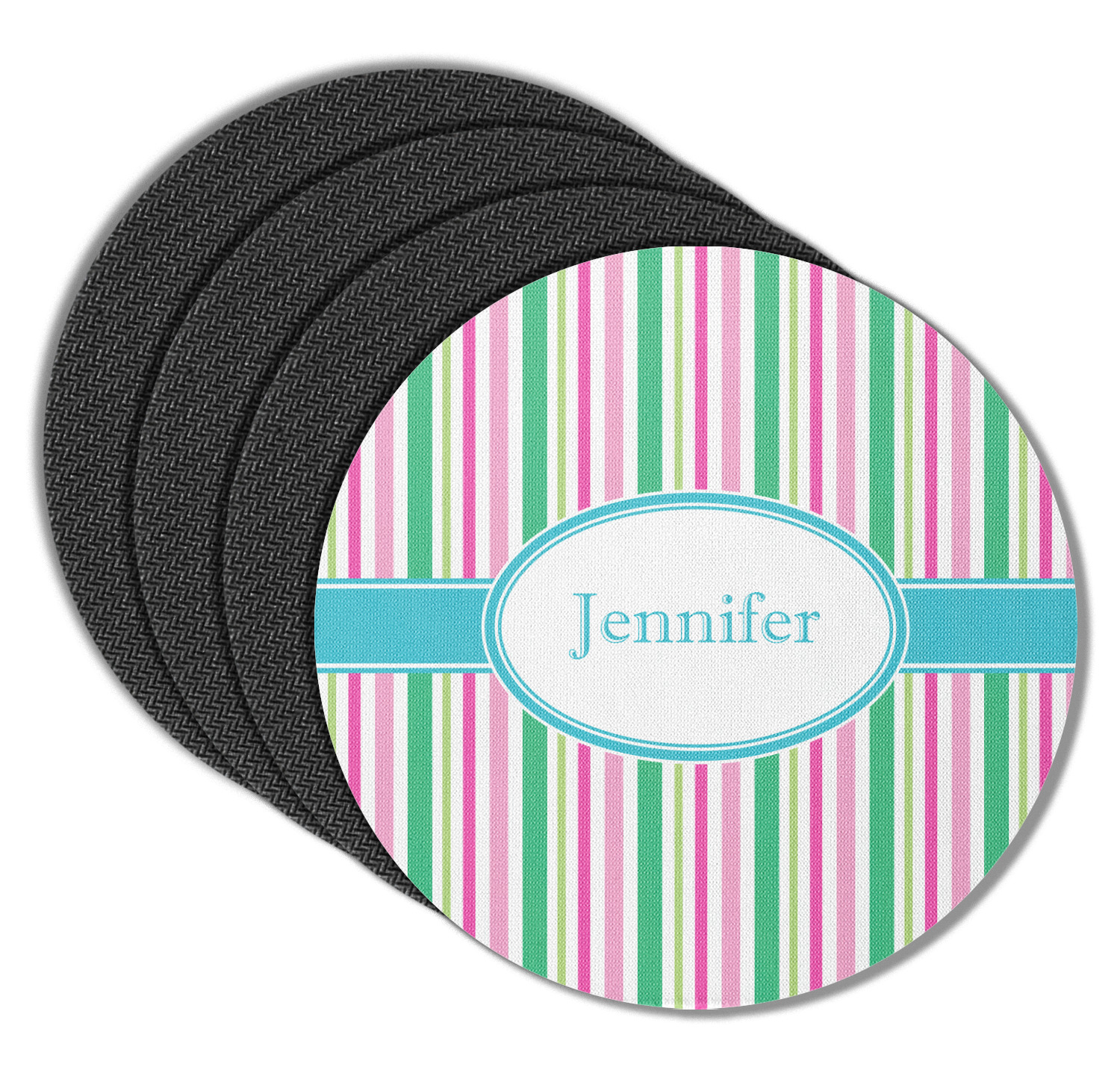 These drink coasters have a smooth, polyester top and a textured, rubber backing on its bottom. The non-slip rubber backing underneath works to keep any spills at bay. At 4 by 4 by 0.25 inches thick, these custom coasters are a suitable size for most drinkware. Your personalization is displayed atop the face of the cup coaster. We sell these rubber coasters in two different shapes: square and round. You can buy each shape as singulars or as a set of 4.