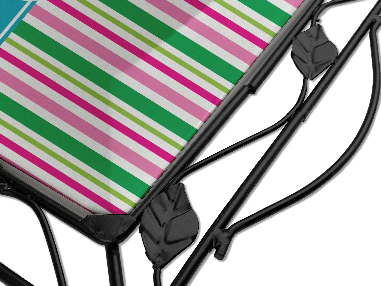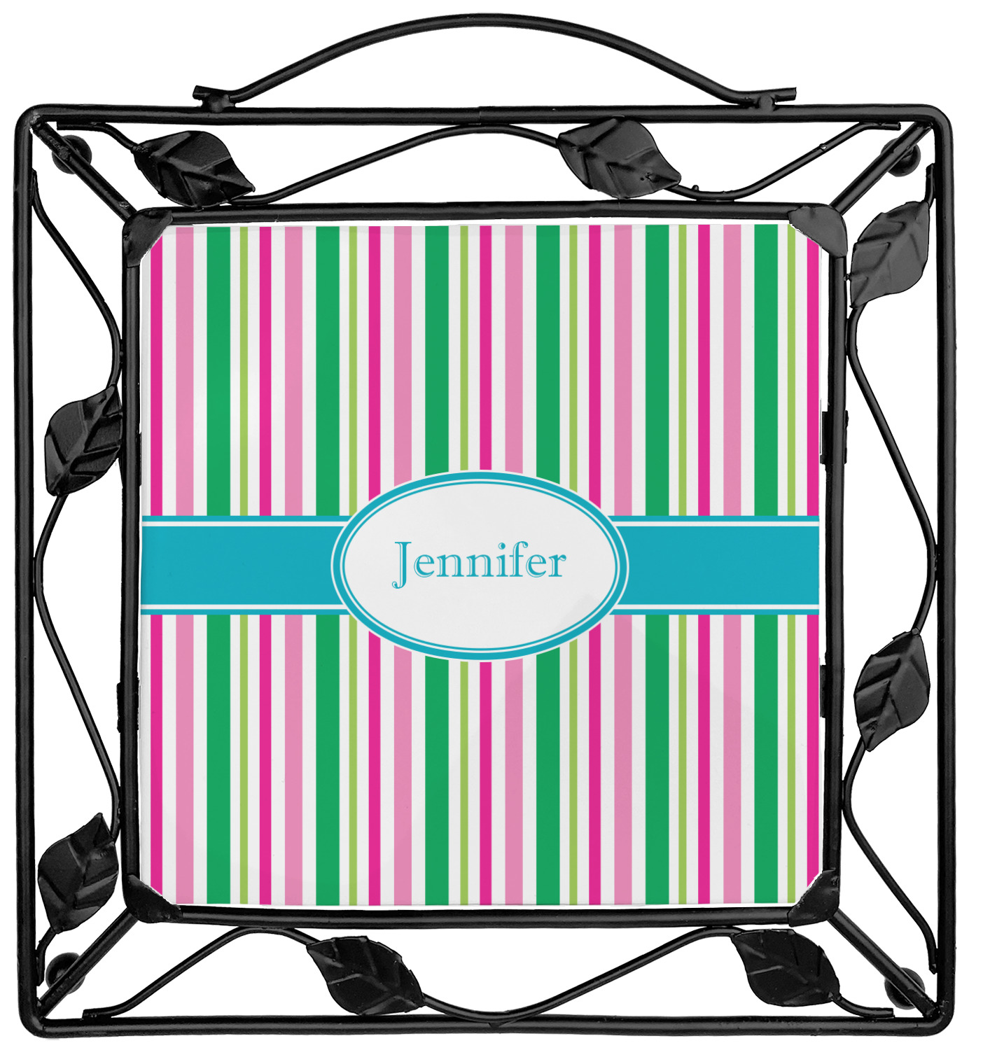 Our square trivets are made from a durable, wrought iron. This model features 4 small half circles, one on each corner, and a larger ring of iron that circles the central, customized tile. Each of the 4 corners has a round foot on its bottom for stability. This trivet is 8.75 by 8.75 inches, but the central tile measures at 6 inches on both sides.