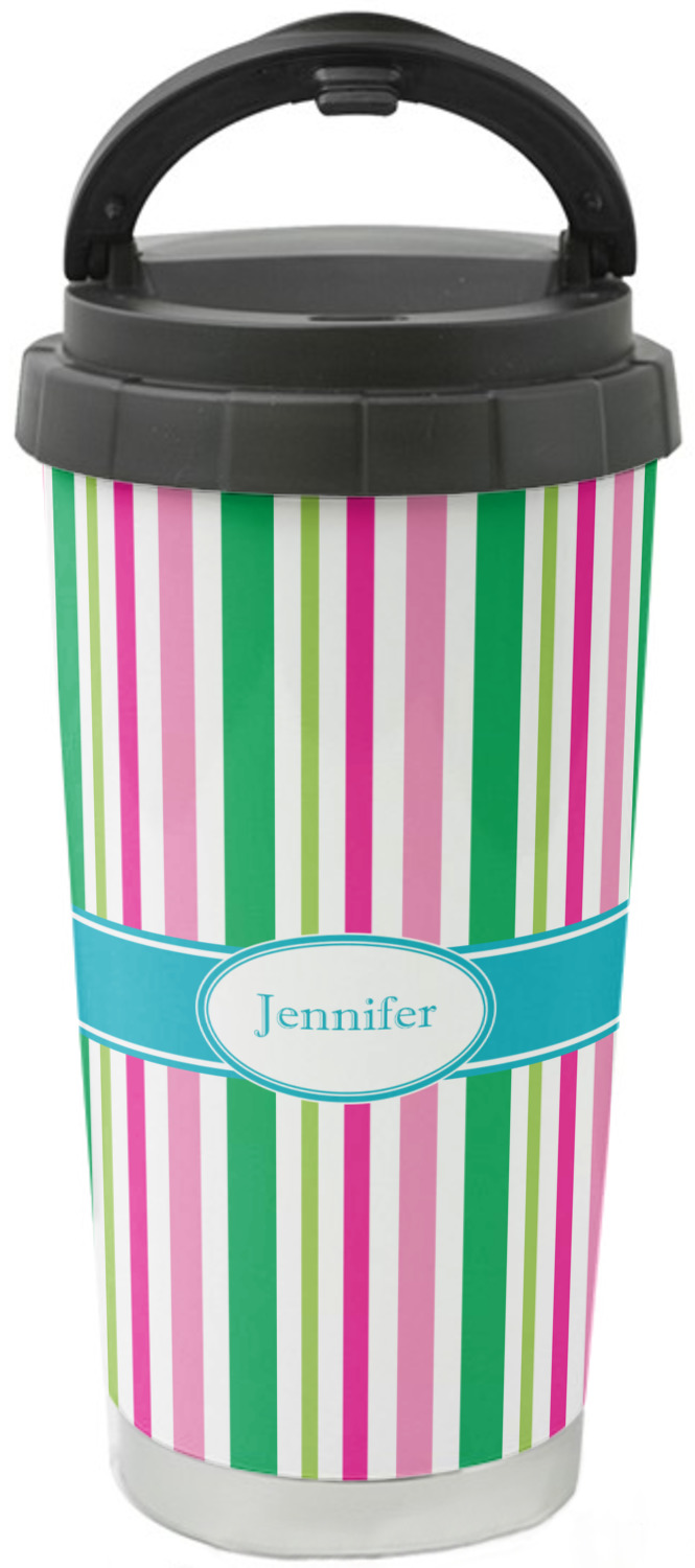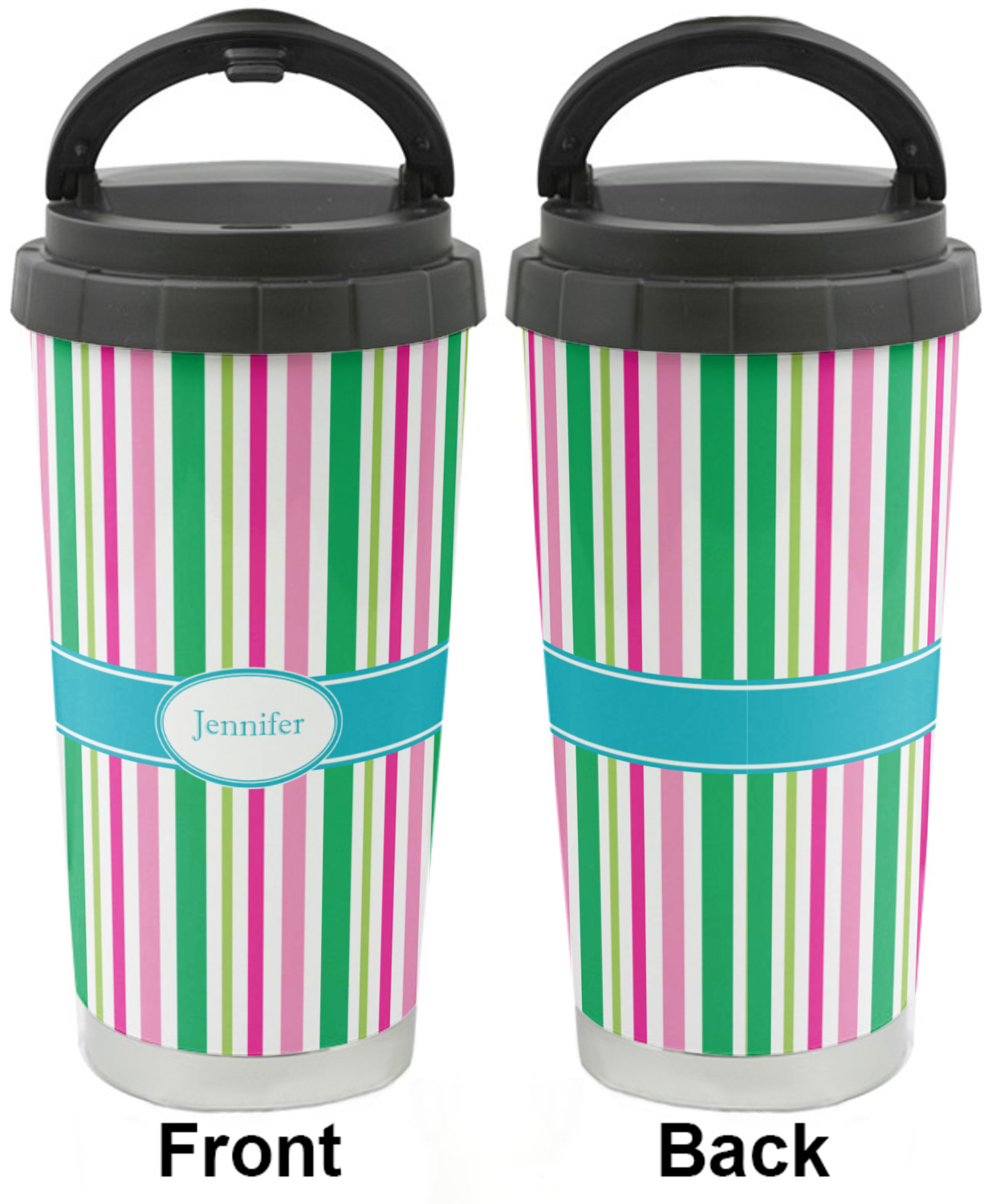 This sleek and tapered 16 oz stainless steel travel cup is a perfect fit in the hand. With the strip of visible stainless steel on the bottom, you'll be feeling classy!