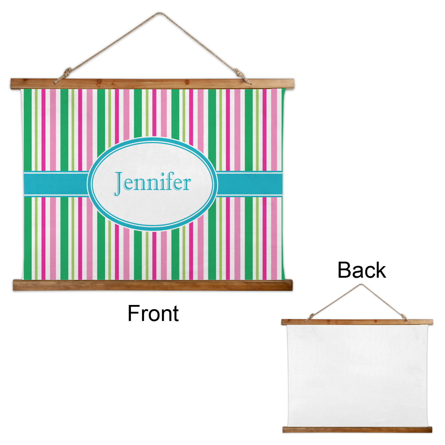 Made in two different orientations - portrait or landscape - both are 26" x 36". Your design is printed on a high quality polyester fabric with hemmed edges. The wood on the top and bottom of the tapestry is 1.25" tall and 0.25" thick and there are two pieces on top and bottom which sandwich the fabric.