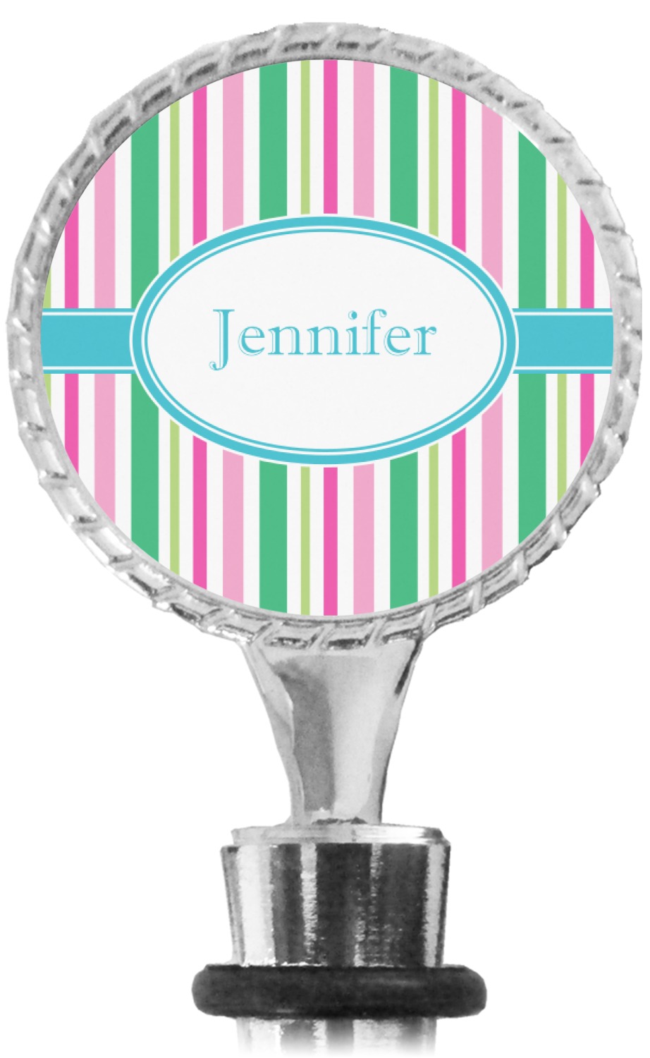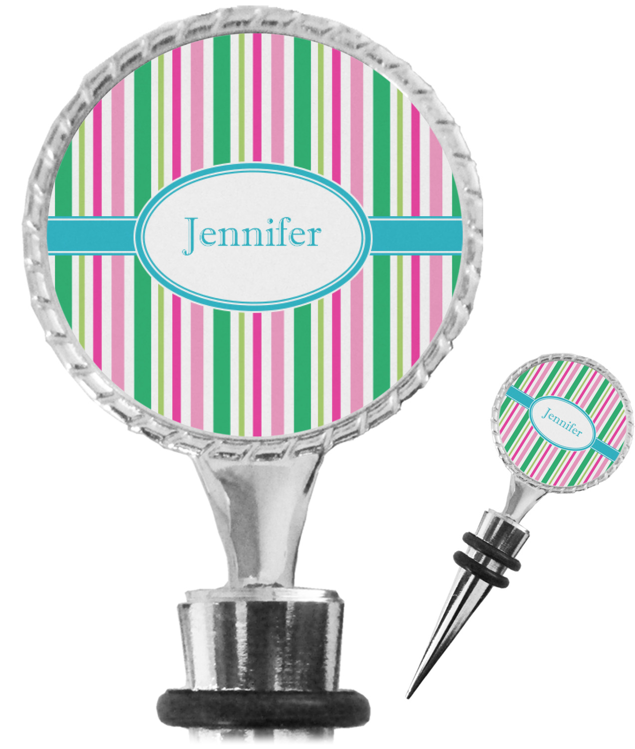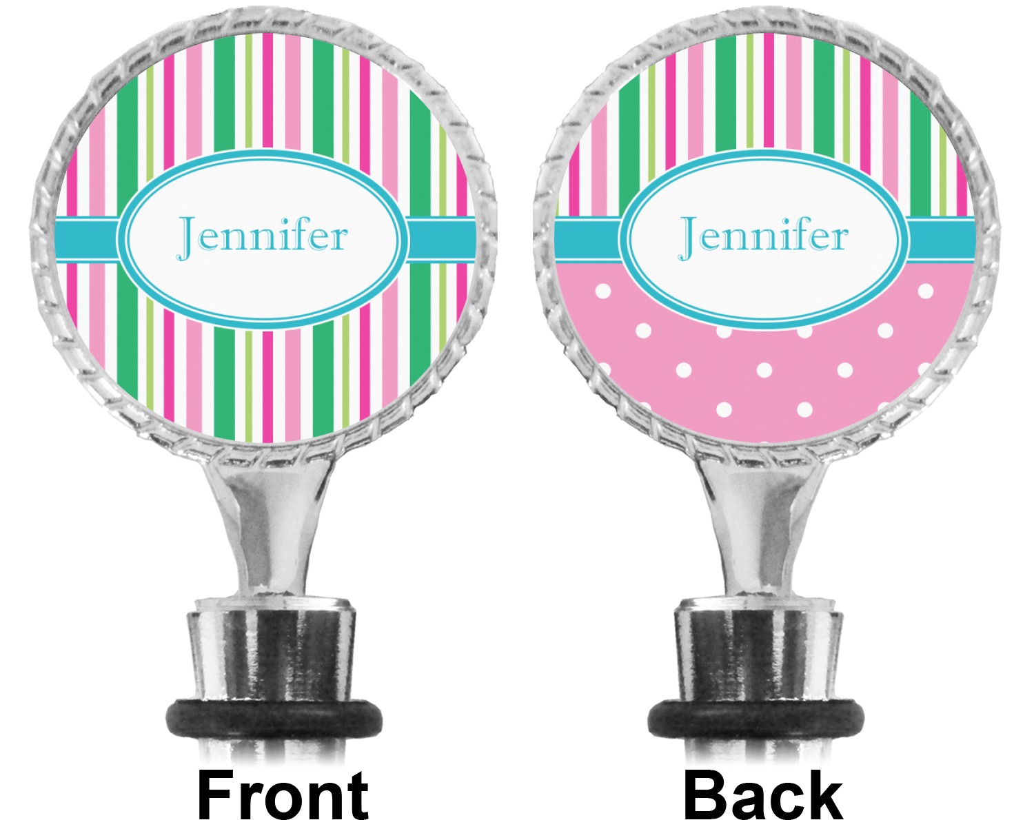 The top part of your bottle stopper is comprised of a zinc ring that displays your customization(s) in its middle, on both sides. The ring is heavy duty, with a bright chrome finish. The body of the wine stoppers have two silicone rings to provide an airtight seal. These wine bottle stoppers measure at 1.625" L x 0.8125" W x 4.625" H; your custom wine stopper is meant to fit into most standard-sized wine bottles.