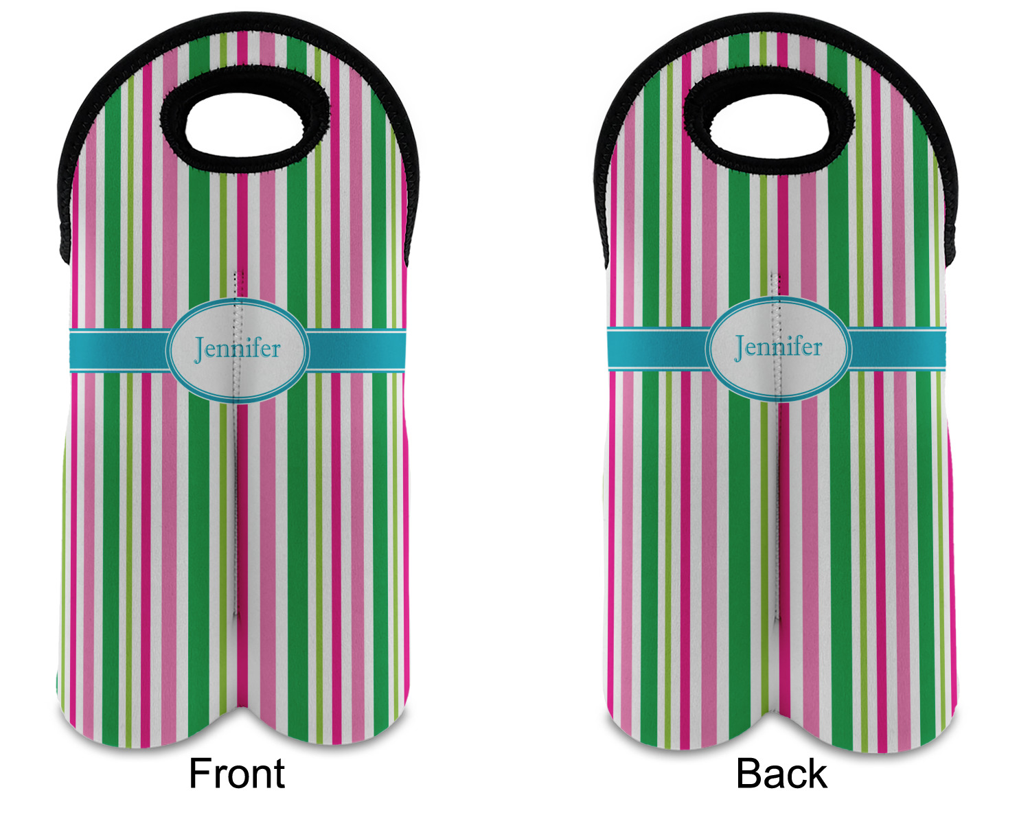 These tote bags are insulated to keep the bottles cold and have a stitched separation down the middle and double handles to keep the two bottles safe and secure during travels.