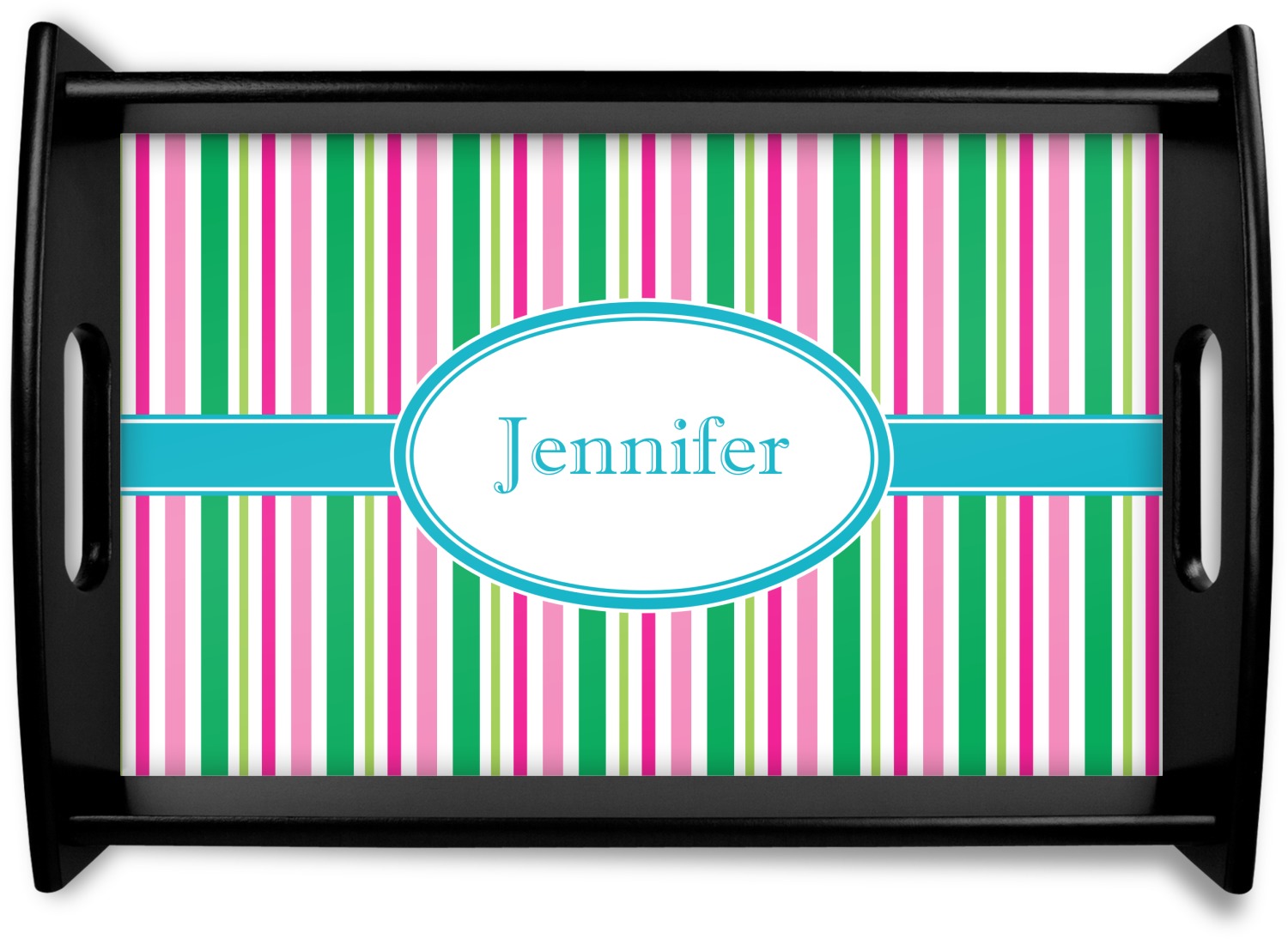 This serving tray with handles features square edges and two rounded sides, creating a very modern look. Each side is fabricated from a beautifully cut, natural wood. The bottom of the interior of the tray displays your customized design in bright, vibrant color. The tray is sold in both a black color and a natural wood look. Each variation of the wood serving tray has two sizes: Small, which is 14" x 10" x 2.25", and Large, which is 19.5" x 13.5" x 2.75".