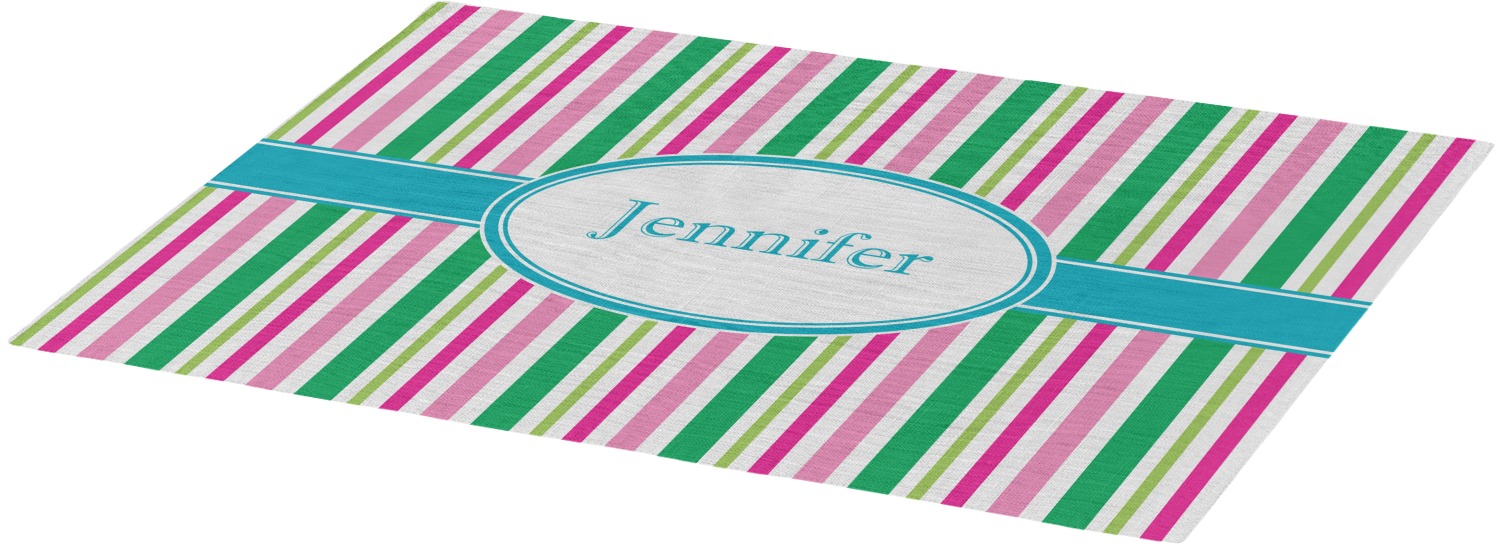 Each of our table mats are a poly twill material with woven burlap detailing. This creates a soft, quality placemat for us to fully print your personalized design across. The woven twill also adds a wrinkle-free surface to set your table! Each customizable placemat is a rectangle shape measuring at approximately 13 x 18 and printed here in the USA.