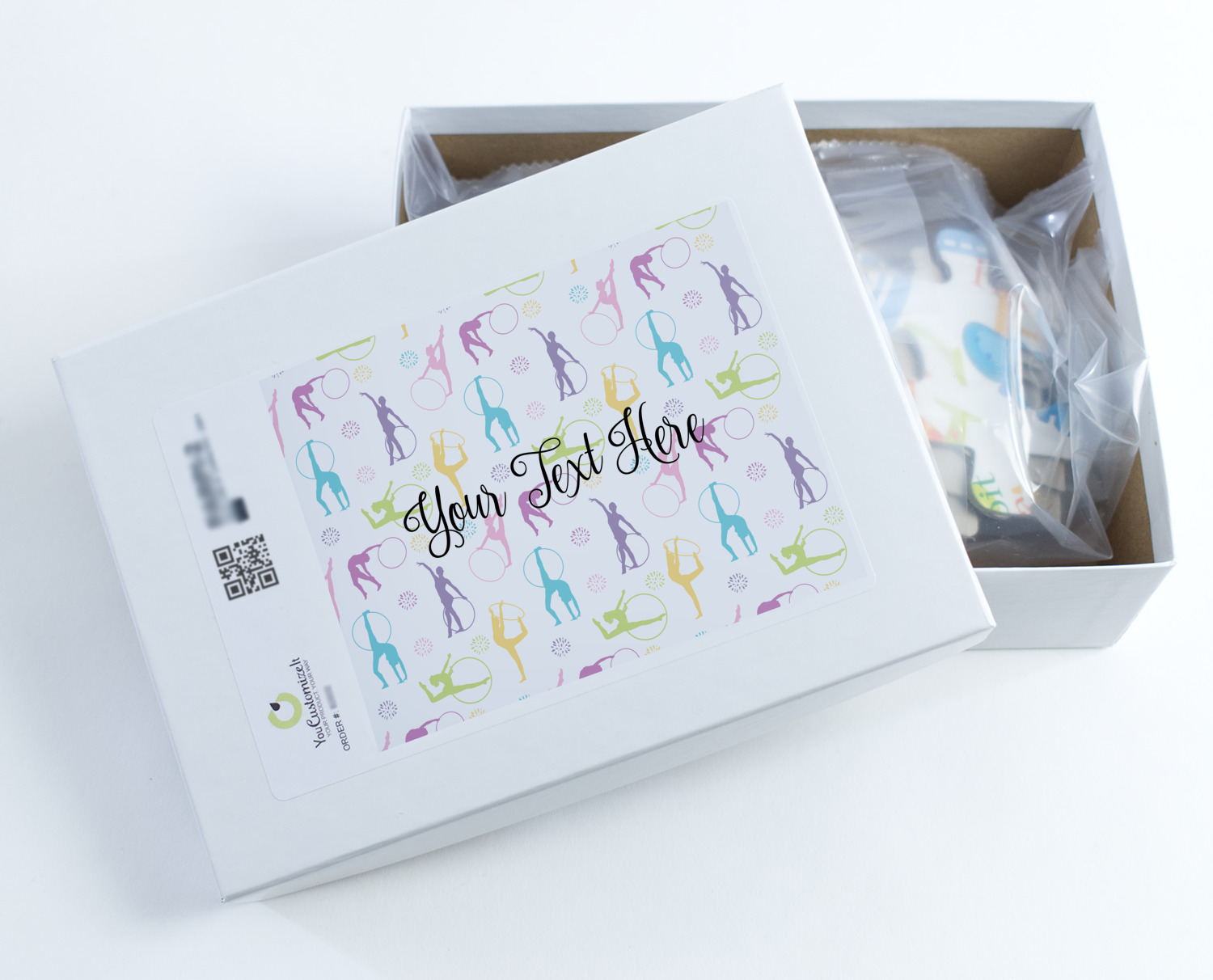 This design template is perfect for gymnasts, their friends and family. The main design features a pattern with gymnasts in pastel colors, some flowers and a white background. The optional personalization is name / text.