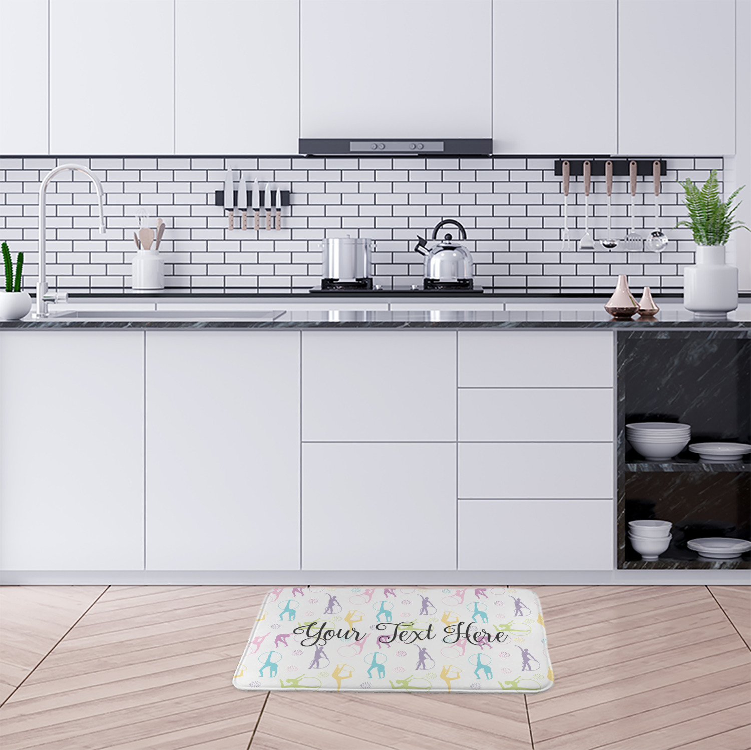 This design template is perfect for gymnasts, their friends and family. The main design features a pattern with gymnasts in pastel colors, some flowers and a white background. The optional personalization is name / text.