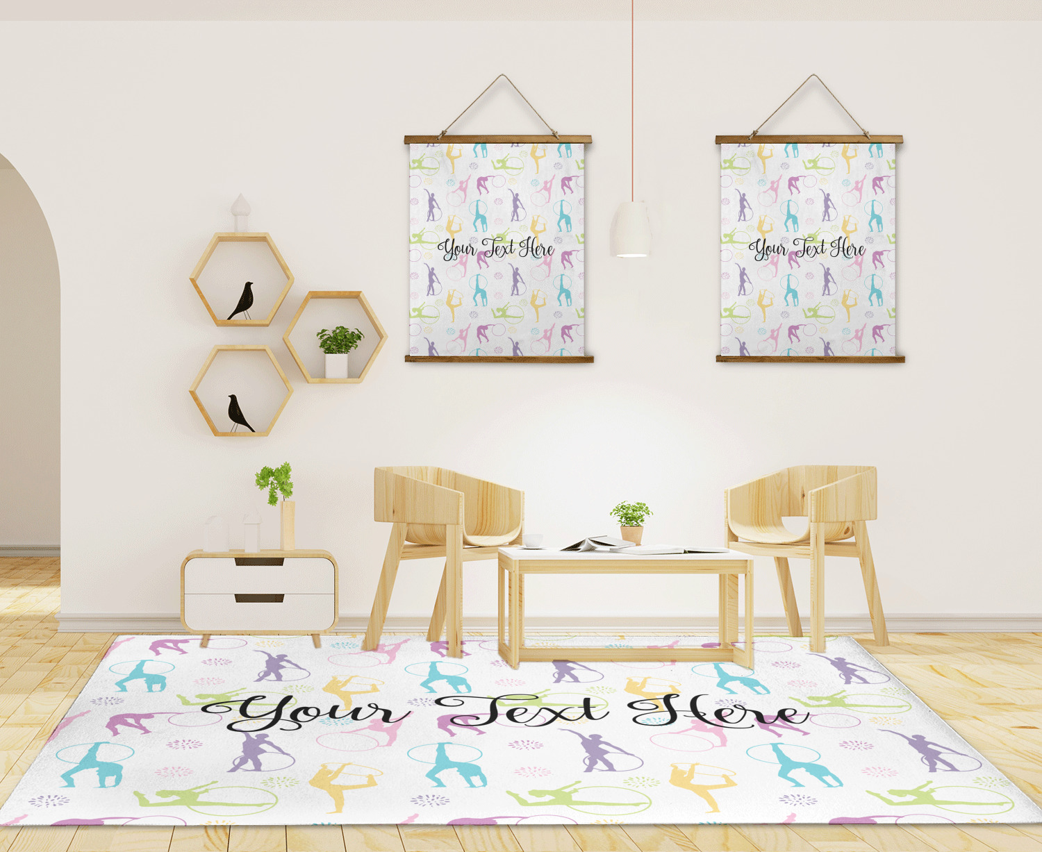 This design template is perfect for gymnasts, their friends and family. The main design features a pattern with gymnasts in pastel colors, some flowers and a white background. The optional personalization is name / text.