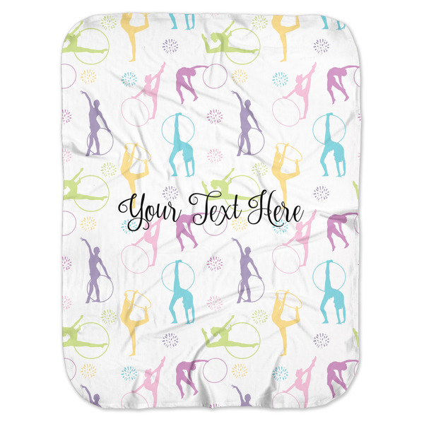 This design template is perfect for gymnasts, their friends and family. The main design features a pattern with gymnasts in pastel colors, some flowers and a white background. The optional personalization is name / text.
